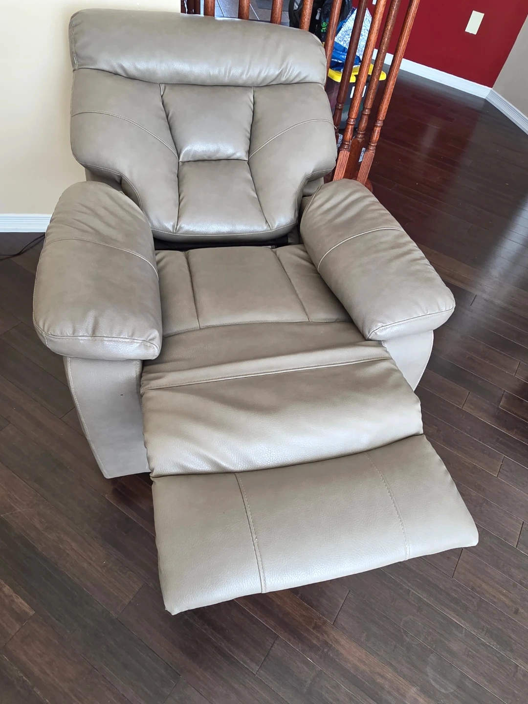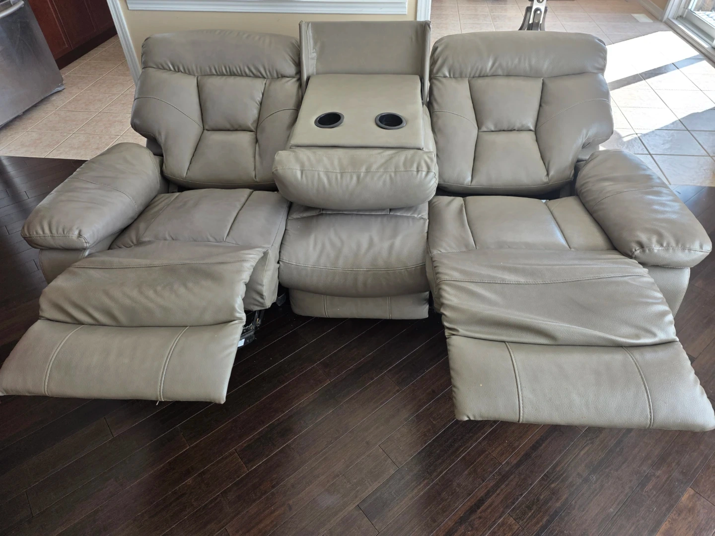 This three-seater reclining sofa offers comfortable seating and convenient cup holders. The material is faux leather, there are some signs of wear as shown in the pictures. Reclines smoothly for relaxation. It's a great option for a family room or home theatre.