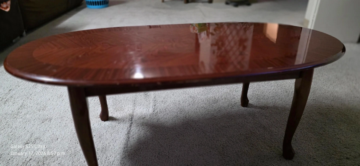 This oval coffee table is made of wood with a rich, dark stain and a patterned inlay on top. It has four sturdy legs and a classic design. This table offers a touch of vintage charm for your living room. It's suitable for most seating arrangements.