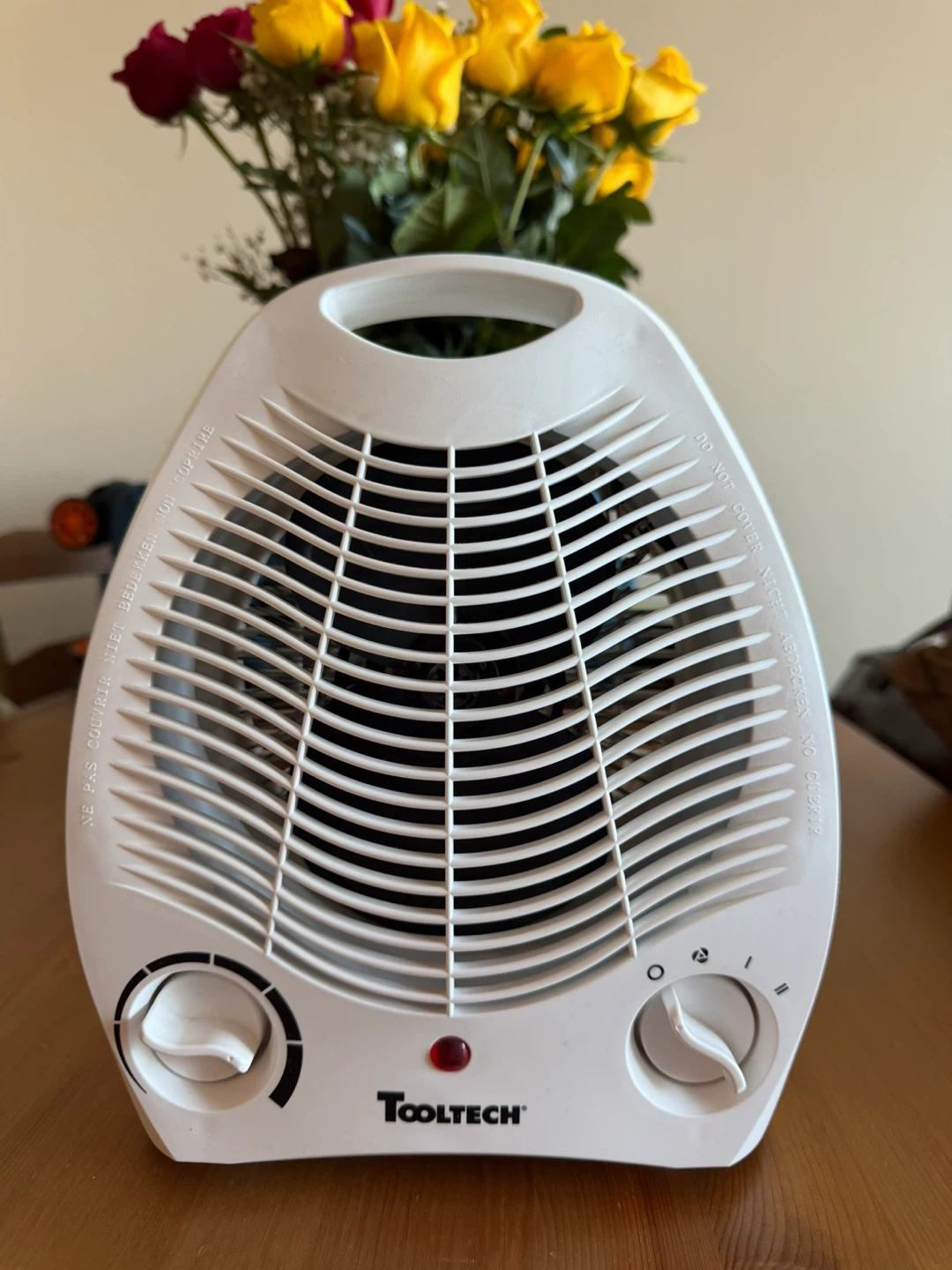 This is a ToolTech portable electric heater fan. It's white and has two control knobs for temperature and fan speed. A power indicator light is also present.