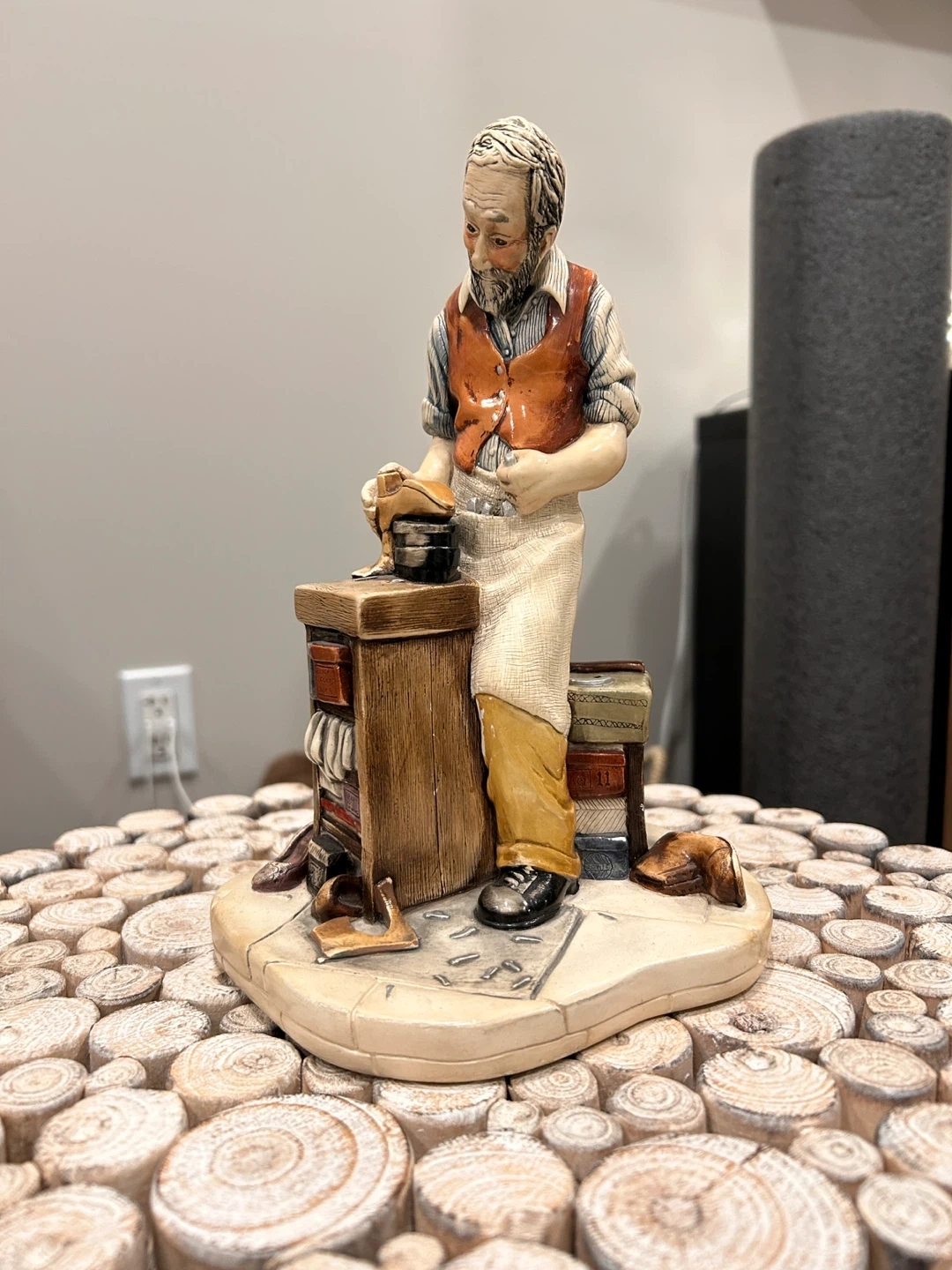 A handpainted stoneware figurine depicting 'Tom Cobbler'. This piece is dated 1975 and made in England. It's a detailed representation of a shoemaker at work.
