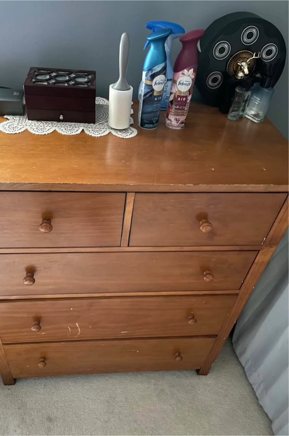 This is a wooden dresser with five drawers. It includes extra hardware and screws for assembly or repairs. Some of the drawers are opened to show contents.