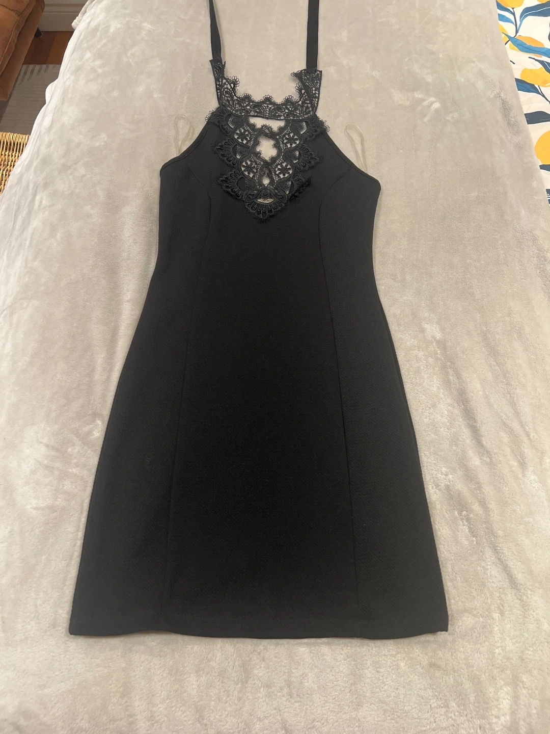 A black mini dress featuring intricate lace detailing at the neckline. Ribbon tie closure . It has a fitted silhouette and adjustable straps. This dress is perfect for a night out or a special occasion! BNWOT, super stretchy material means it can fit up to a medium. Pick up only near Runnymede stn. Message for additional photos
