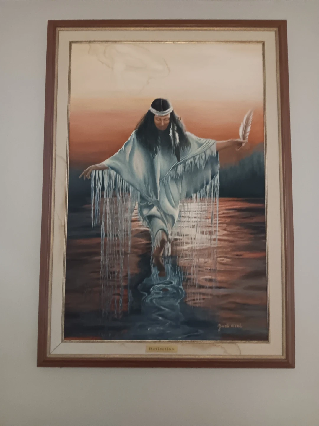 Framed art titled "Reflection" depicting a woman walking through water. The artwork is signed by artist 'Greta Noel'.picture is 24 yrs old a bit of water damage from storage unit must sell ASAP estate sale