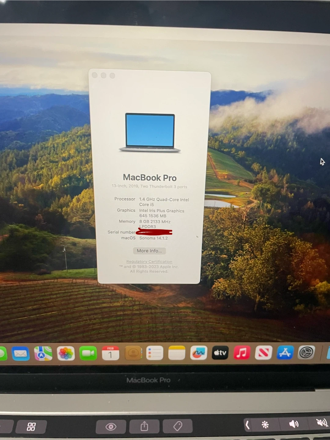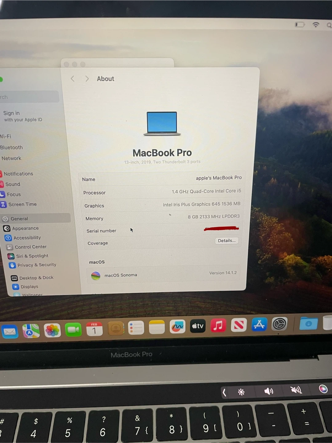 This MacBook Pro is a 13-inch model from 2019, featuring two Thunderbolt 3 ports. It's equipped with an Intel Core i5 processor, Intel Iris Plus Graphics, and 8 GB of 2133 MHz LPDDR3 memory. The storage capacity is128GB SSD. It runs macOS Sonoma, version 14.1.2. This laptop is great for everyday tasks and productivity!