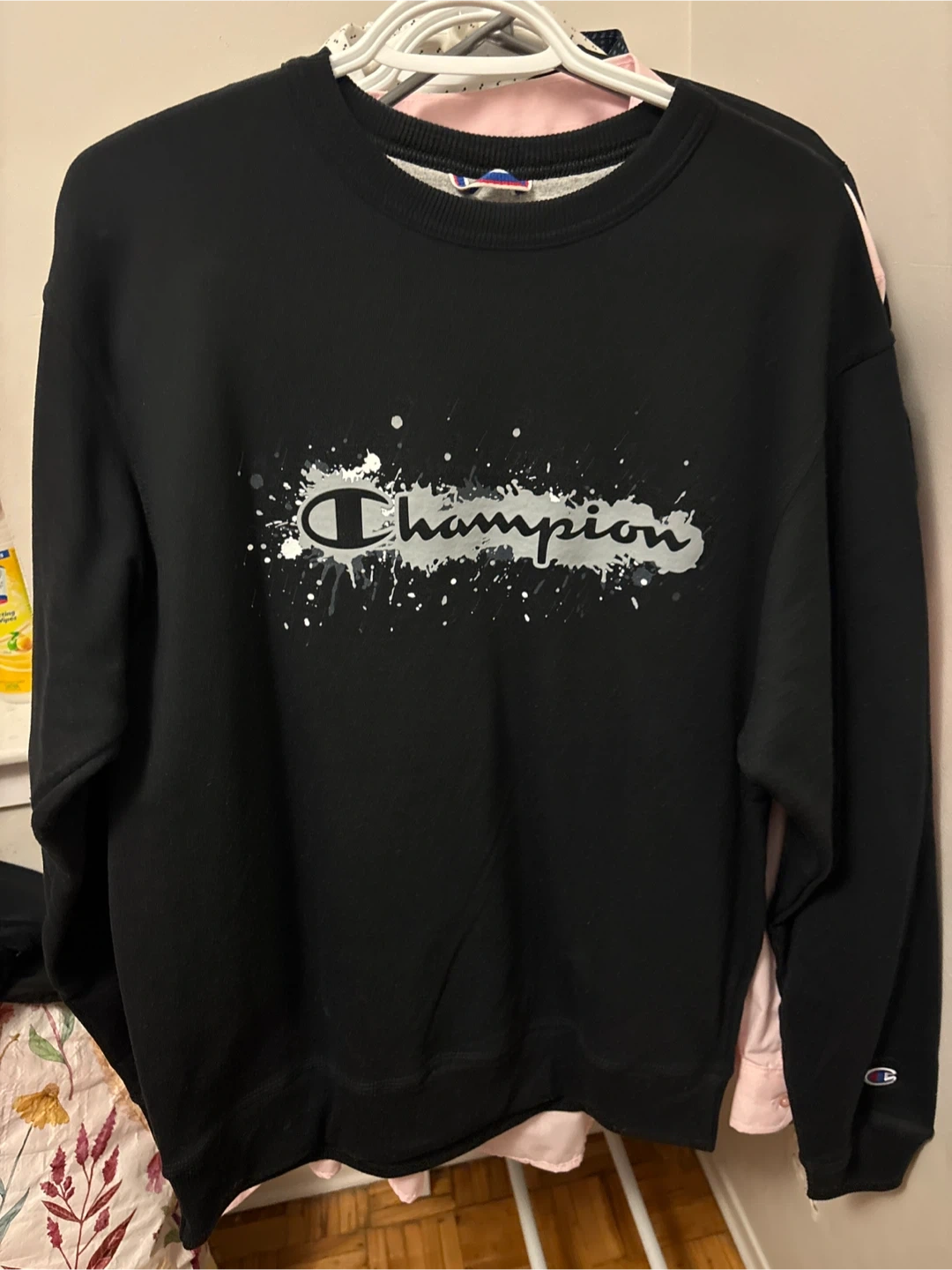 This is a black Champion crewneck sweatshirt with a graphic splatter logo across the chest. It's made for a comfortable fit.