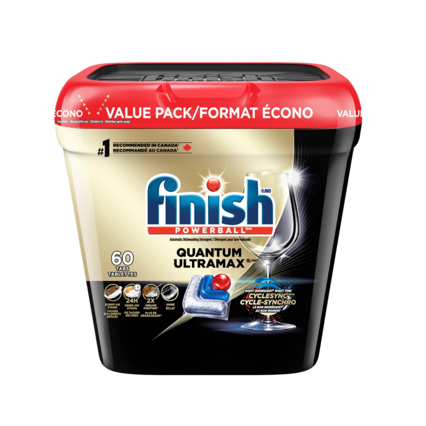 Ce contenant de 60 tablettes Finish Quantum Ultramax est un format écono. Il est recommandé au Canada. Les tablettes combattent les taches incrustées et séchées.