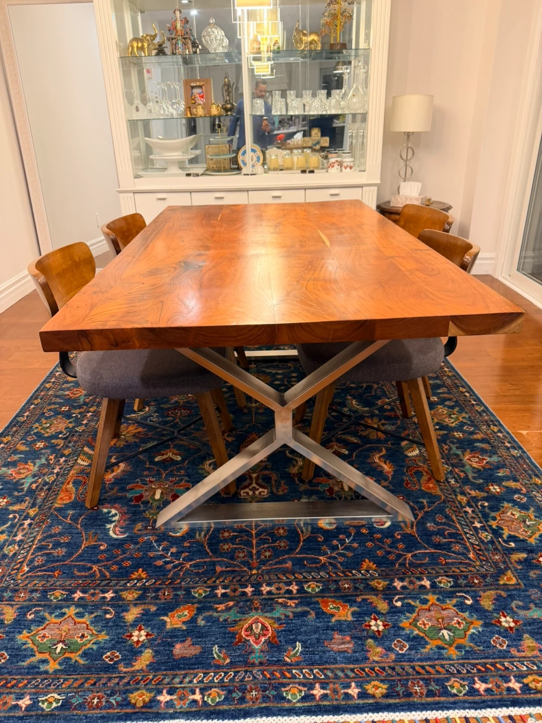 Spacious dining table with a beautiful live edge wood top and a sturdy metal pedestal base. It comfortably seats six people. Perfect for family dinners and entertaining guests! Minor scratches. Very sturdy and heavy wood. Great table for daily use. Chairs and carpet NOT included) Selling below market value.