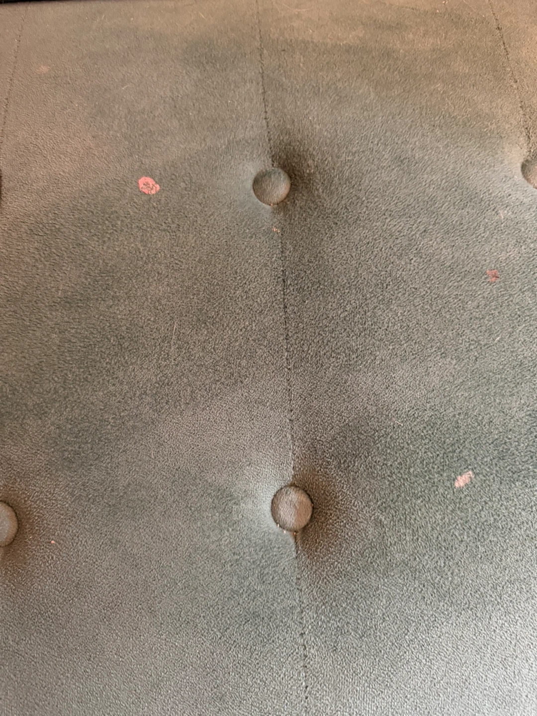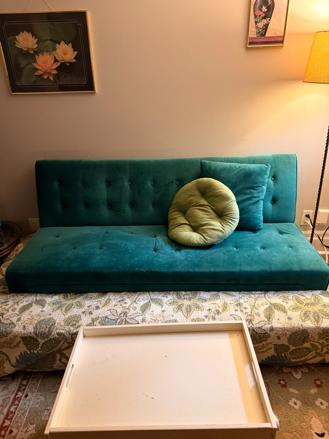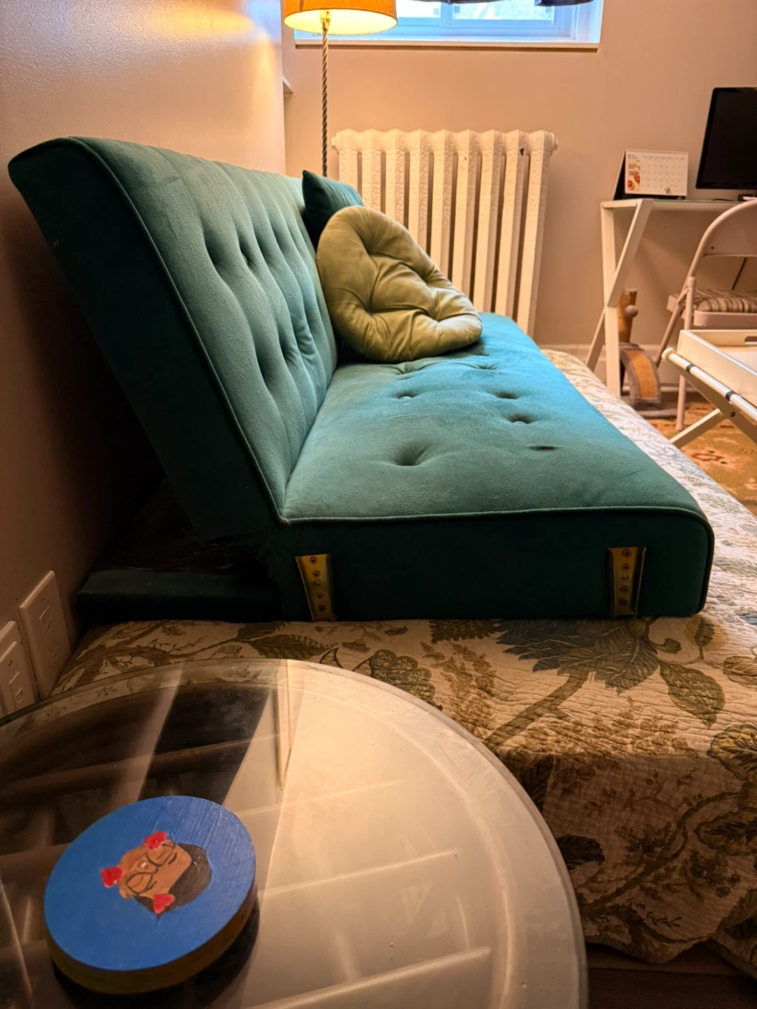 Giving away this teal sofa bed, features a classic tufted design with button accents. It's a stylish piece that can convert from a sofa to a bed. There are two small paint spots on the left side, pictured. The throw pillows are included!