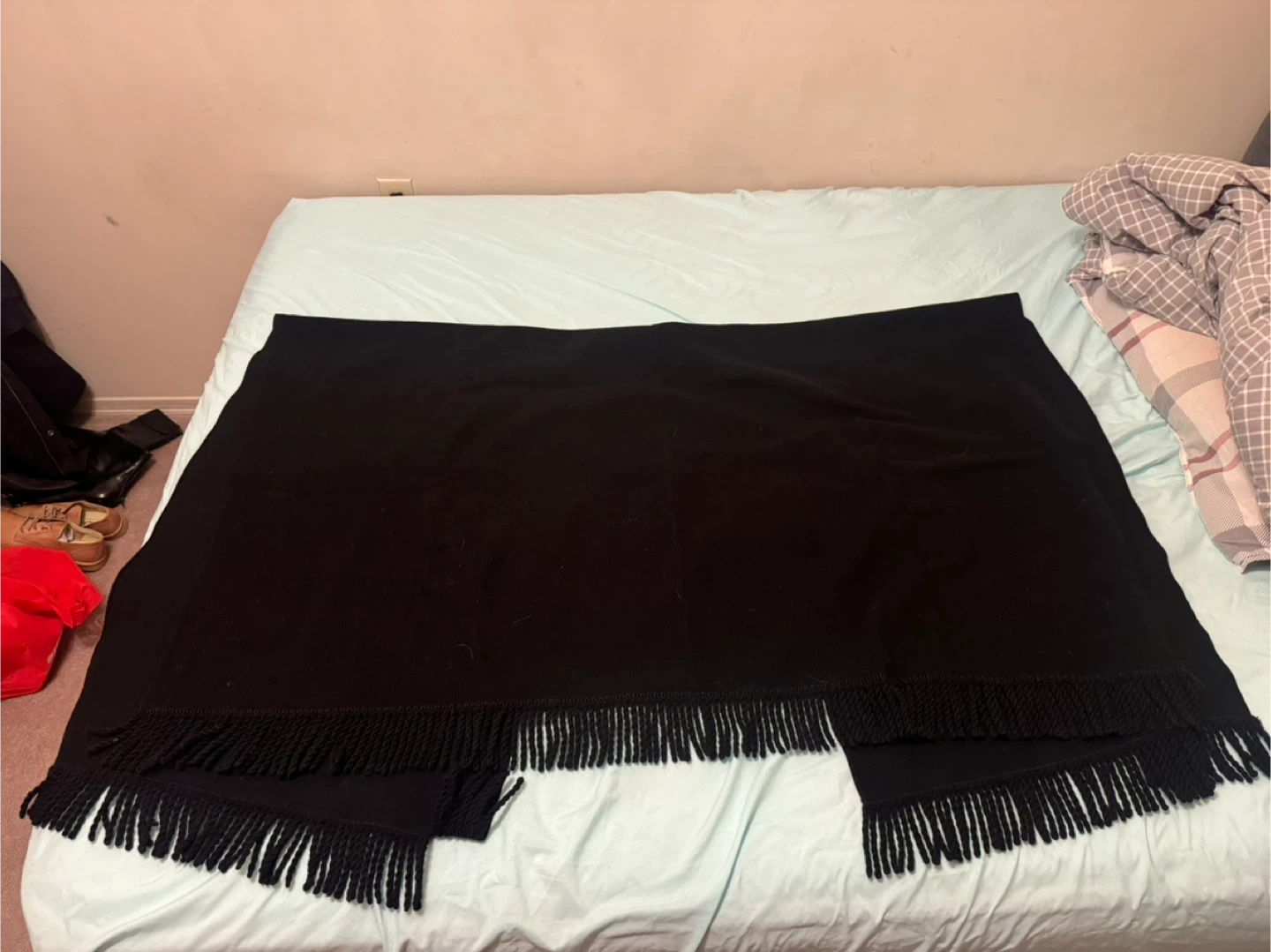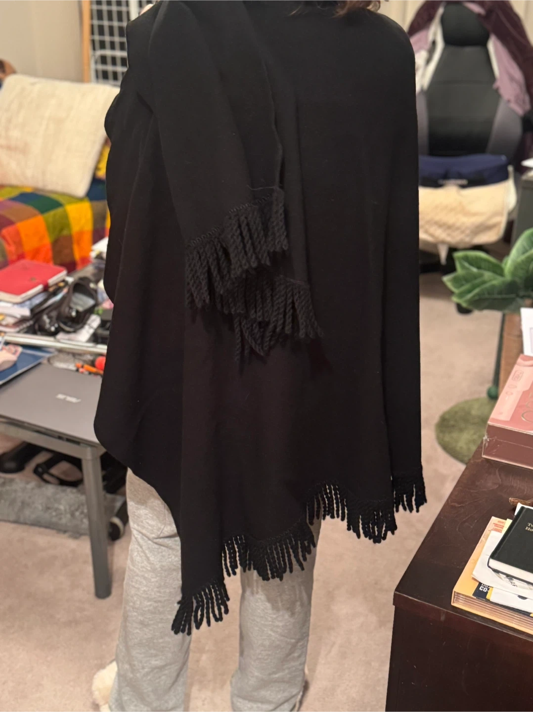 Selling a stylish Holt Renfrew black poncho with fringe detailing!