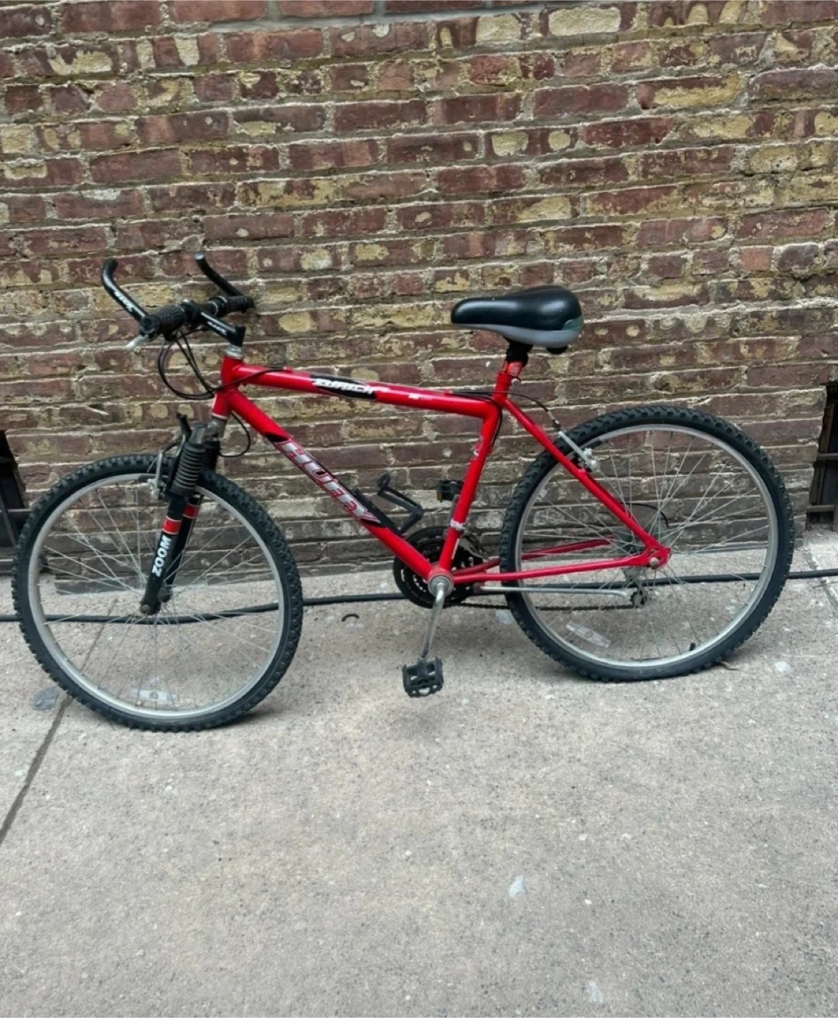 This is a red Huffy mountain bike. It's equipped with 26-inch wheels and a front suspension fork. Ready for your next adventure!