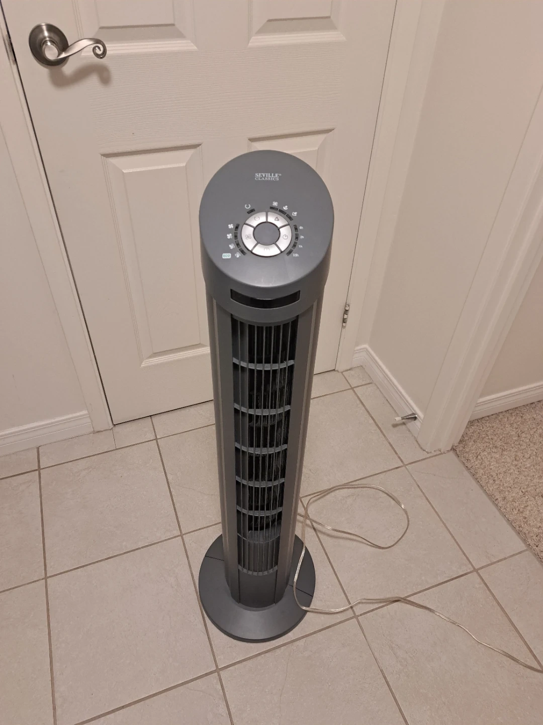 Seville Classics tower fan in grey. It has multiple speed settings and a timer function. This fan is great for circulating air in a room.