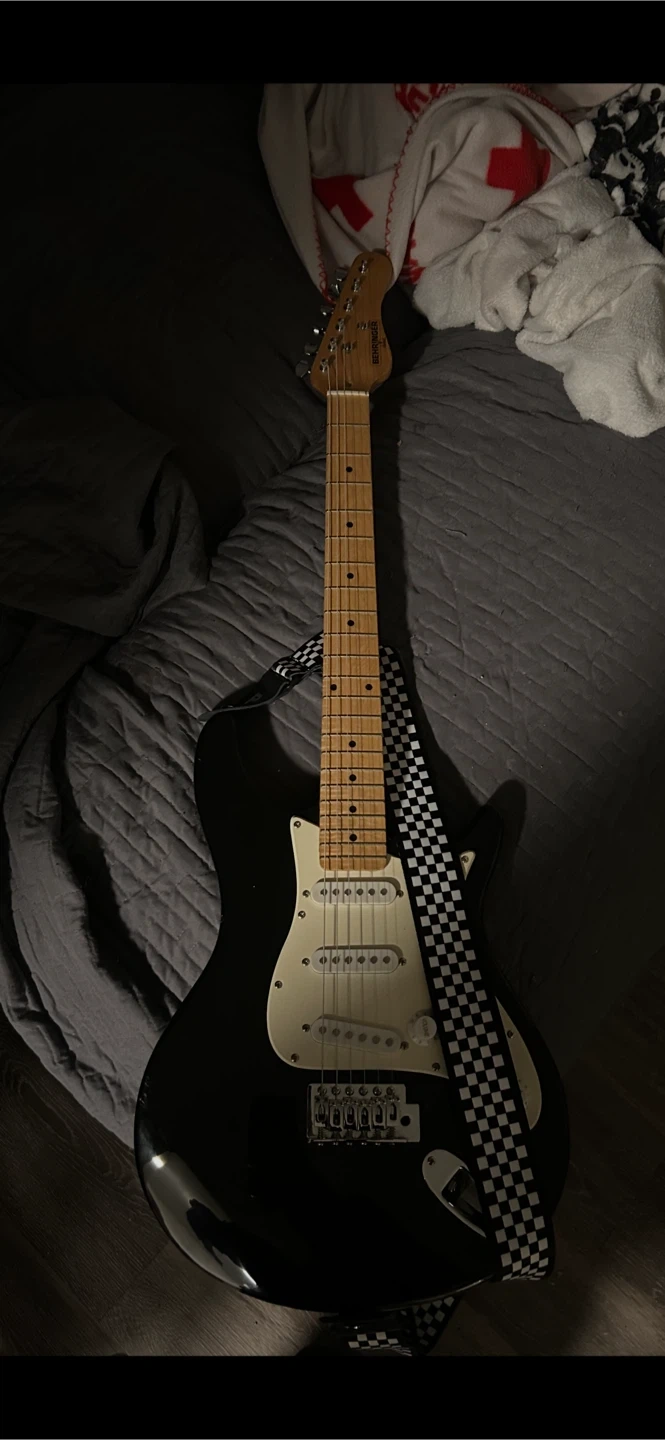 Black electric guitar from Behringer. It's a strat-style guitar and includes a checkered strap. Maple neck and fretboard. Strap and Tuner included! i am also open to trades!!