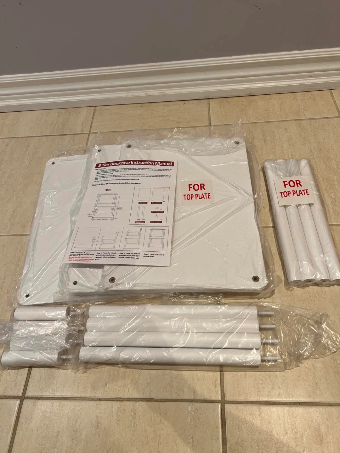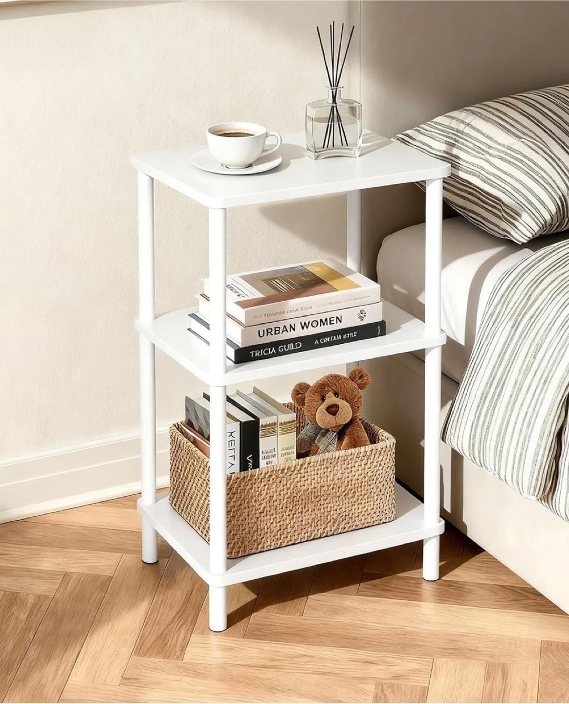 This is a simple white 3-tier side table. It's made of durable material and has a clean, modern design. Its compact size makes it handy for small spaces.