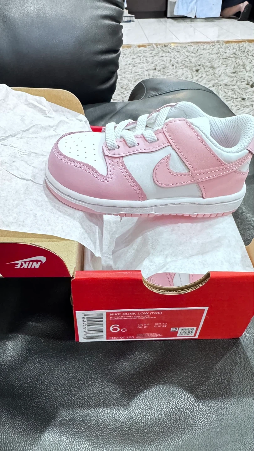These are girls' toddler Nike Dunk Low sneakers in pink and white. They're a size 6c, UK 5.5, EUR 22. Includes original box.