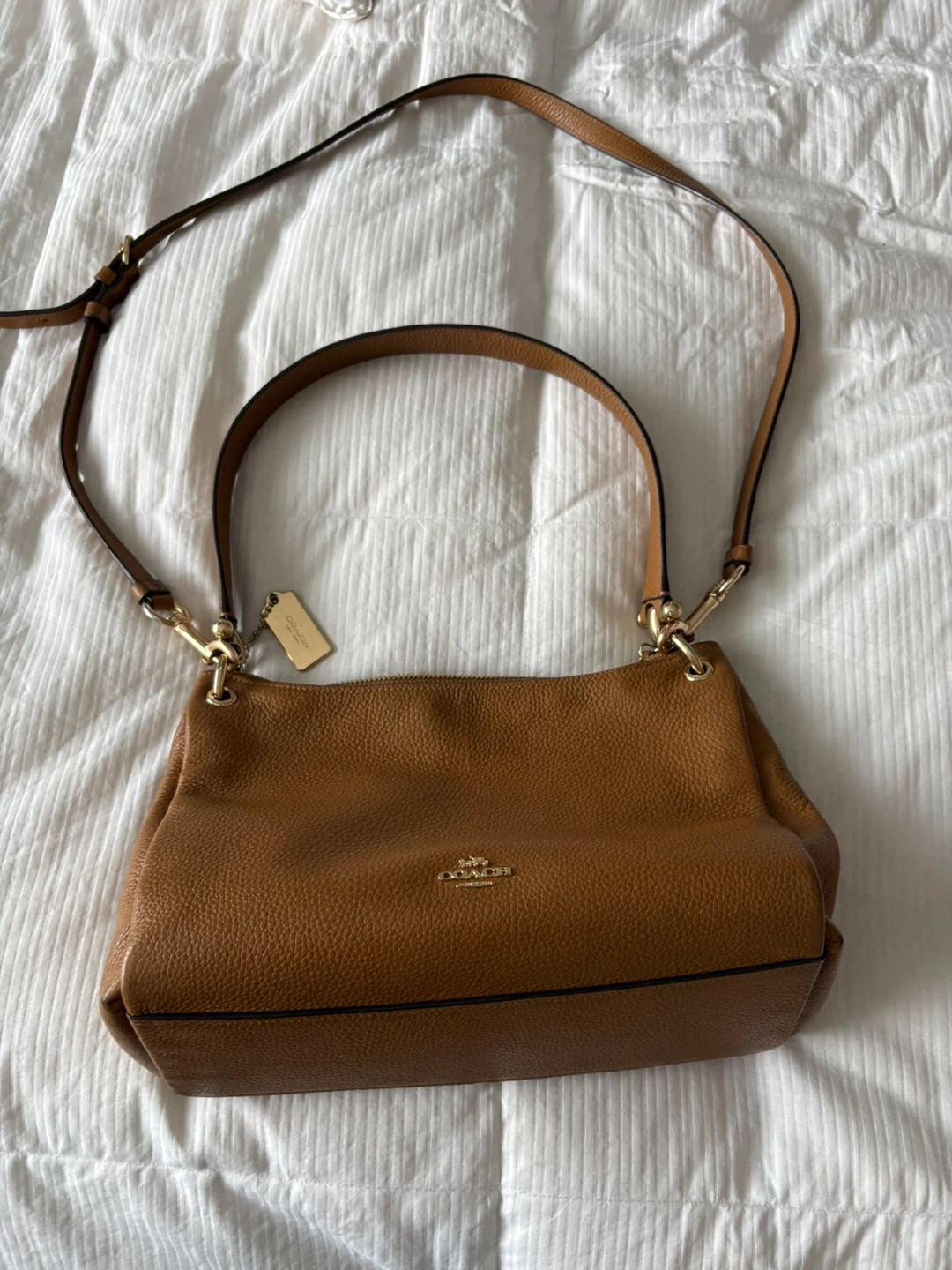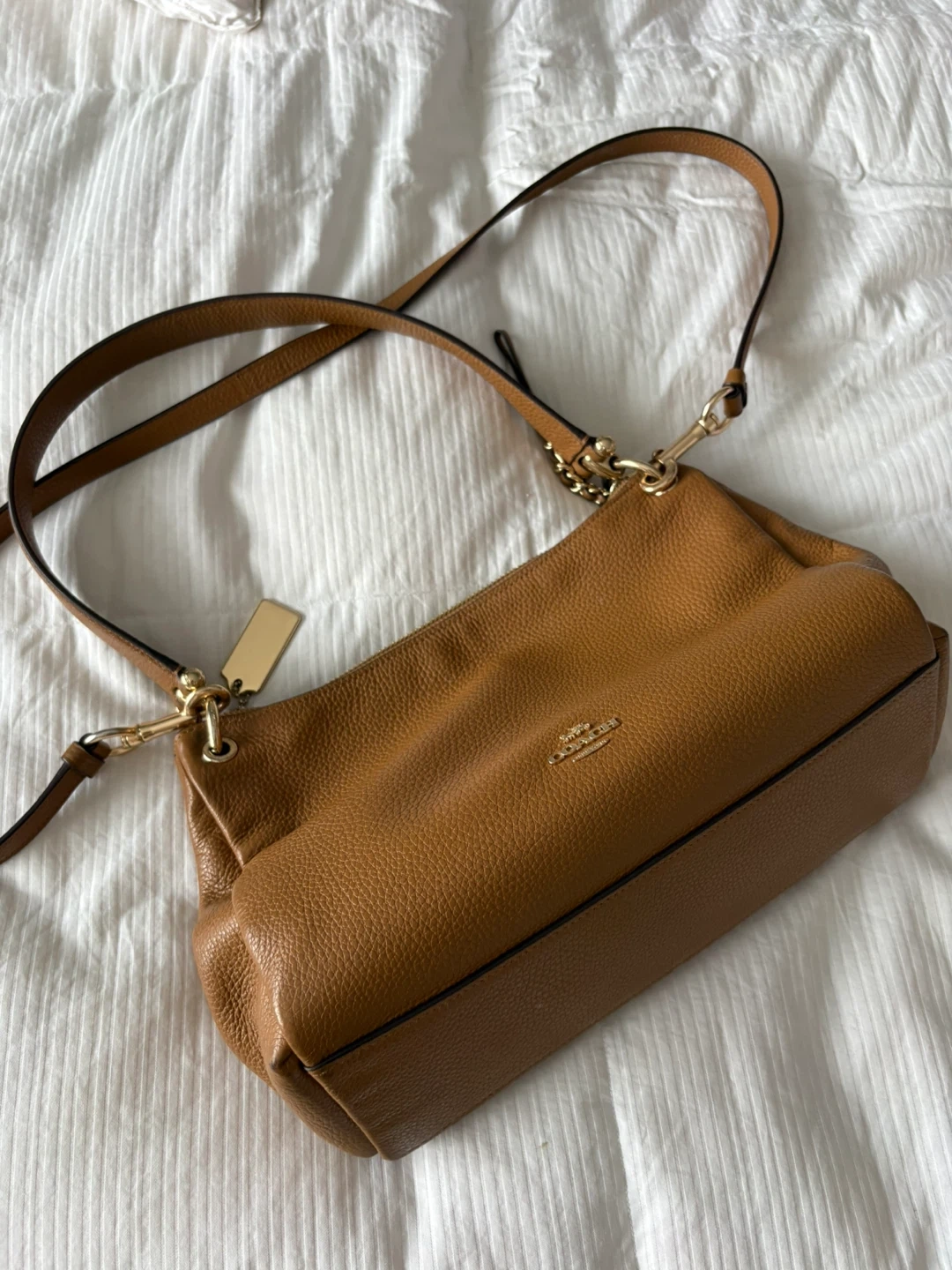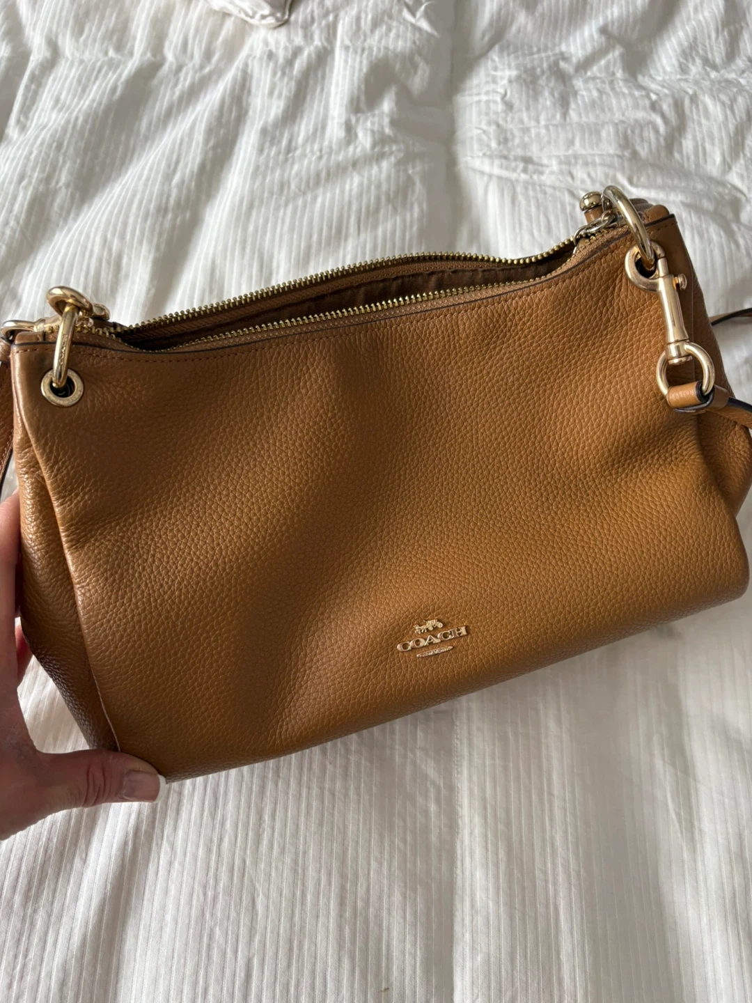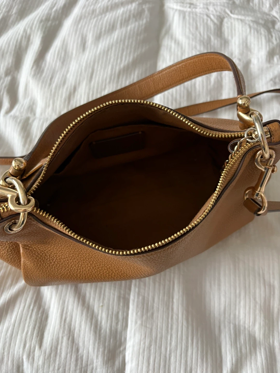 This is a brown leather shoulder bag by Coach. It features gold hardware and a zip closure. The interior has a simple compartment and a small tag. Pick up only in Beaumont