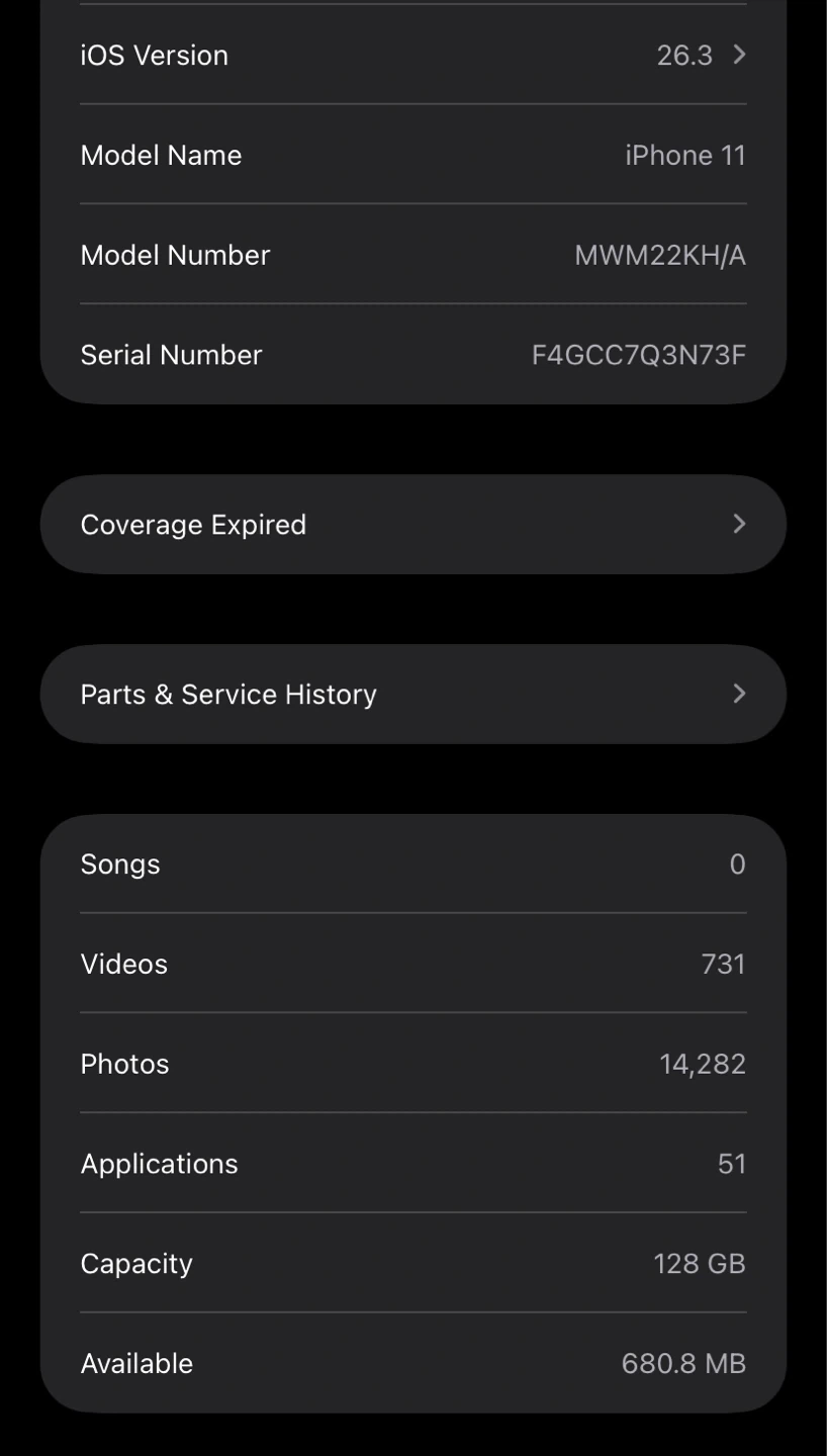 This is an Apple iPhone 11 in white. The maximum battery capacity is 73%. It has optimized battery charging enabled.