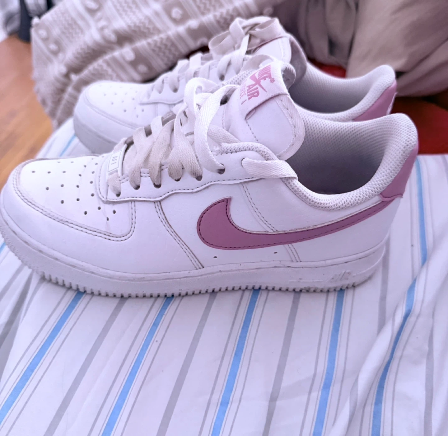 Selling a pair of Nike Air Force 1 sneakers in white with pink accents. They're in good condition and ready for a new owner! Size is women's.