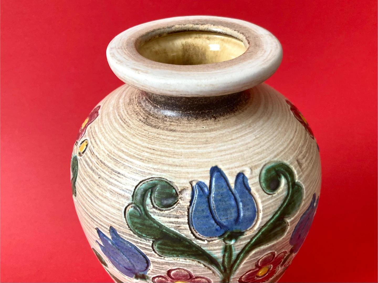 - featuring engraved details depicting deep blue tulips, green leaves, and colorful yellow and red floral accents in a folk art style with a rustic finish and earthy beige tones on the base