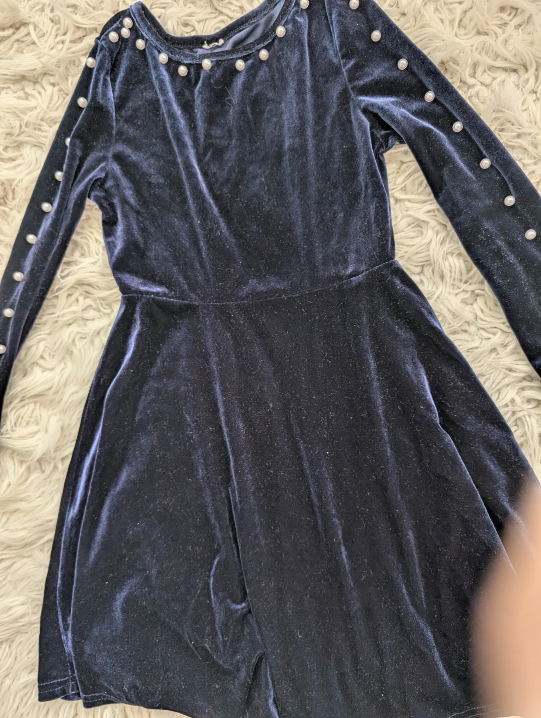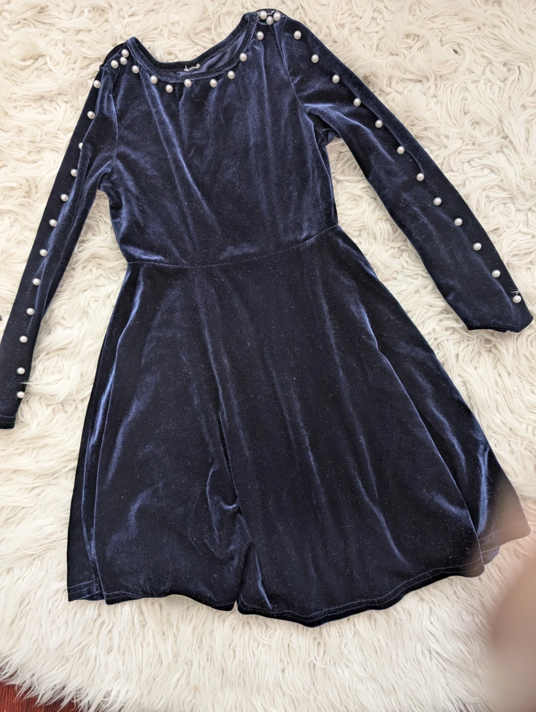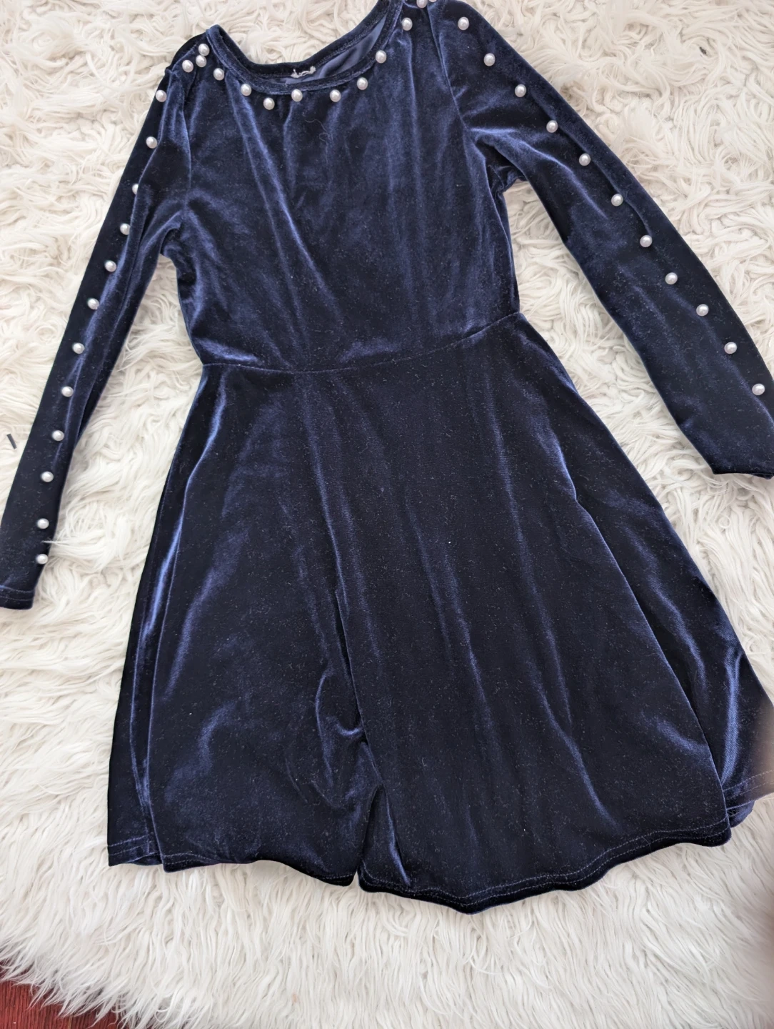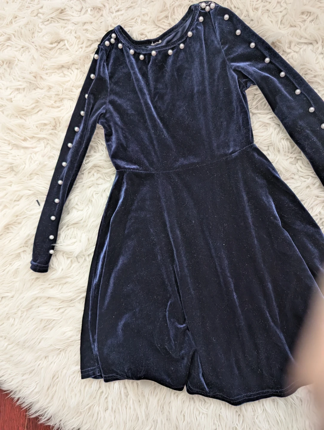 A navy blue velvet dress with long sleeves and pearl detailing around the neckline and cuffs. It's a lovely piece perfect for parties or special occasions. Velvet material.