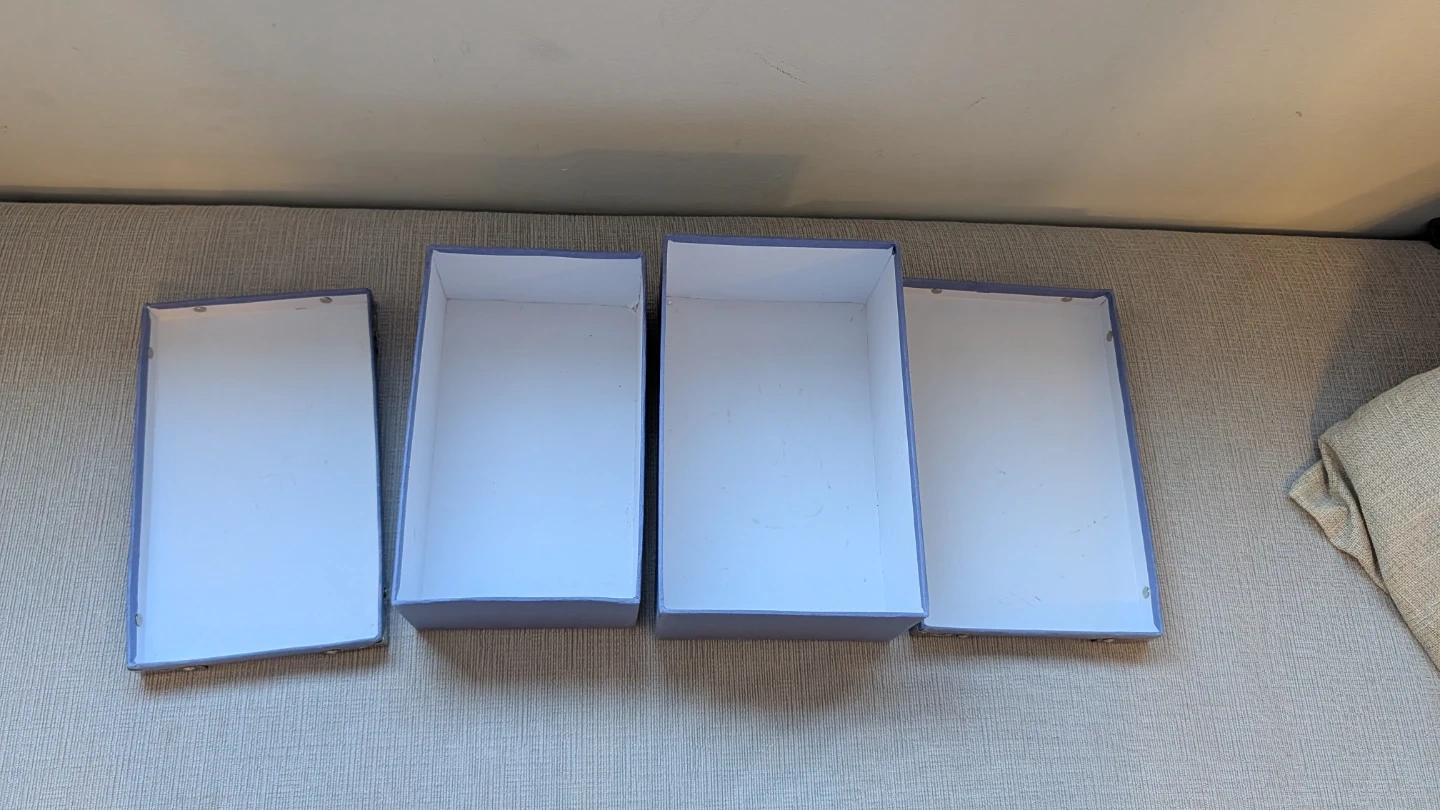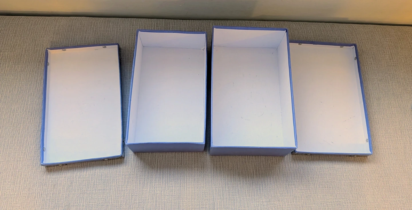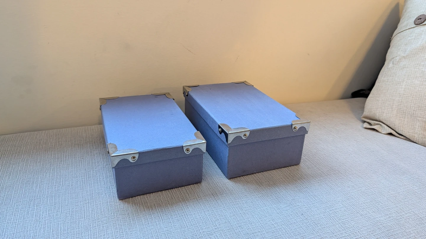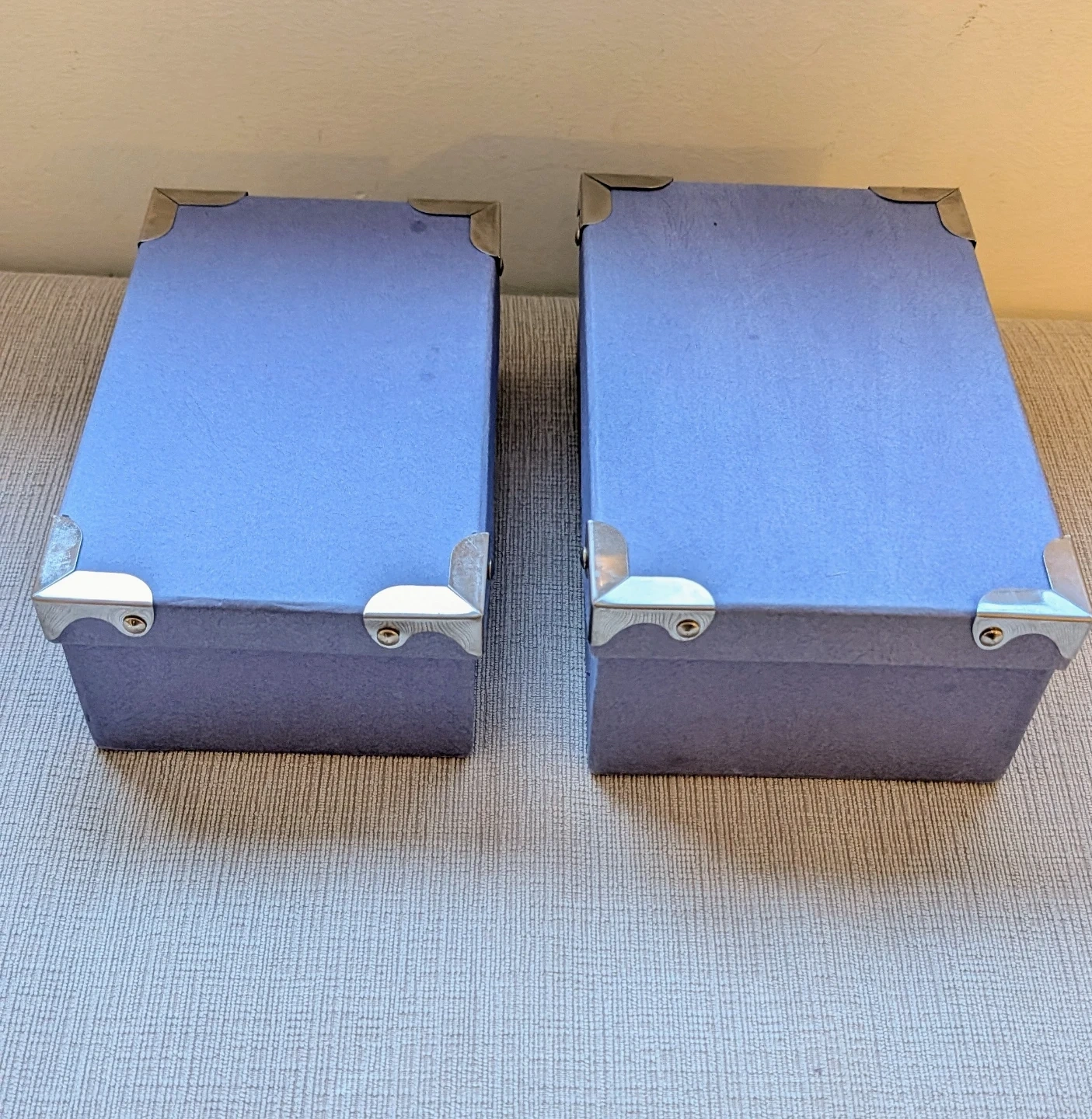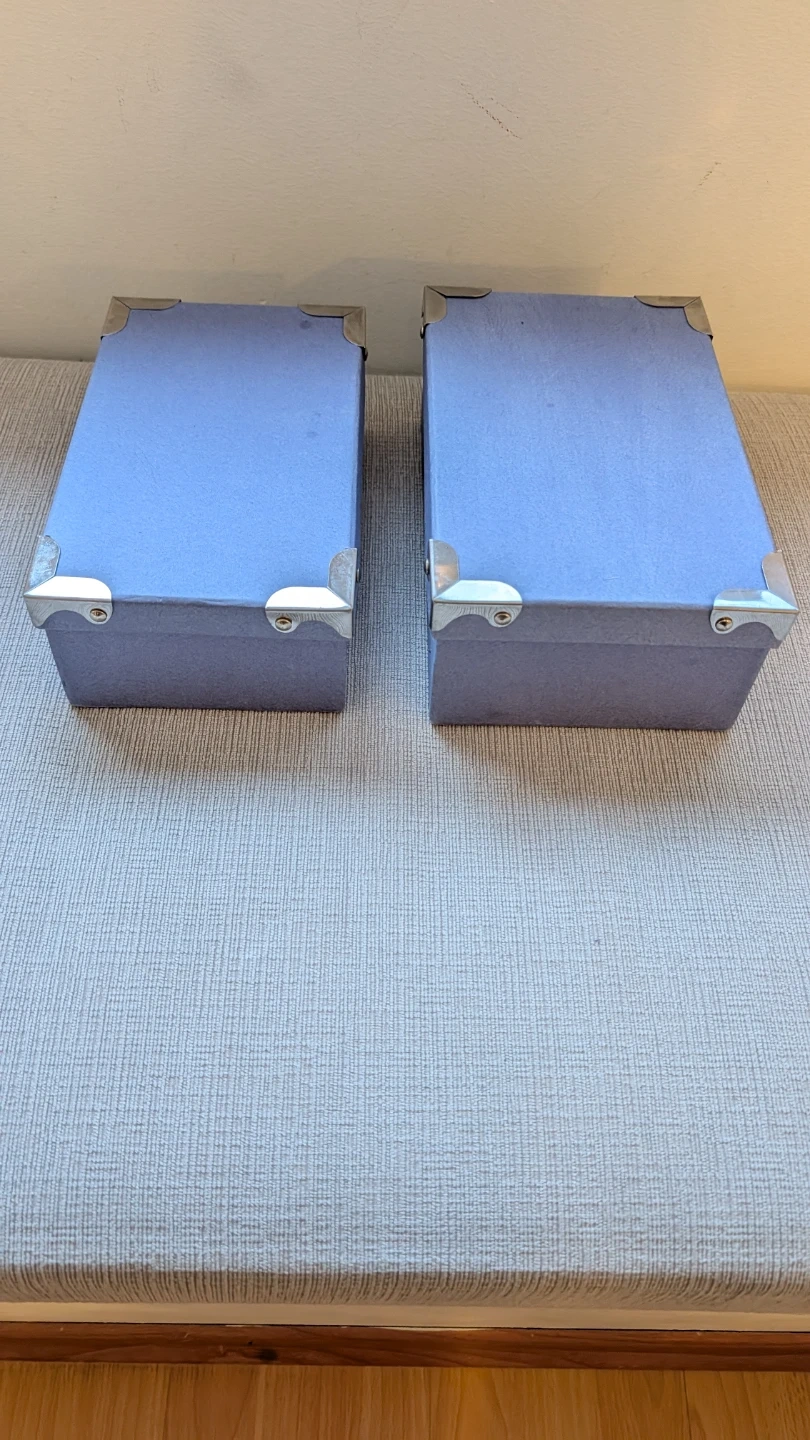 Selling a set of two blue storage boxes. They're great for organizing small items. Each box has reinforced metal corners for durability. They're perfect for tidying up shelves or closets!