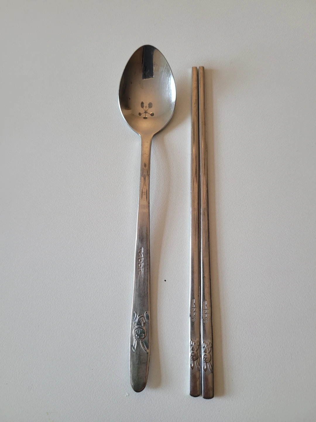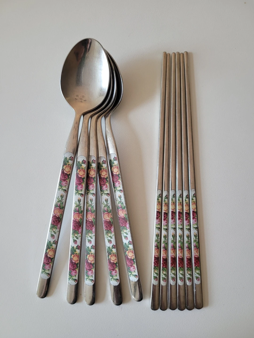 Set of stainless steel spoons and chopsticks with a delicate floral design. Adds a touch of elegance to your dining experience. Dishwasher safe.