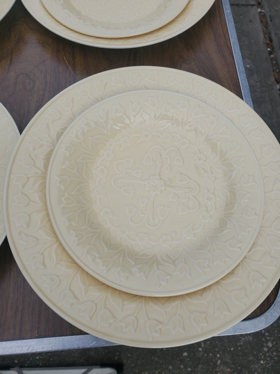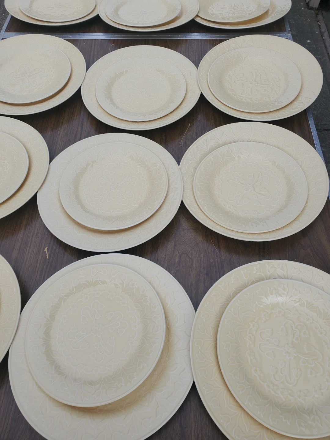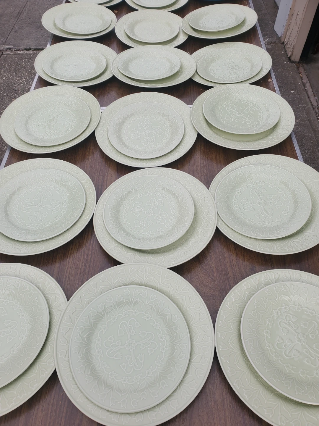 128 made in japan dishes. 2 different sets . One light yellow one light green. 32 dinner plates and 32 dessert plates green and 32 dinner 32 dessert yellow.. these are expensive vintage sets. Paid $1000.. Great condition used 2 times. $150 cash great price. .must pickup sheepshead bay brooklyn.