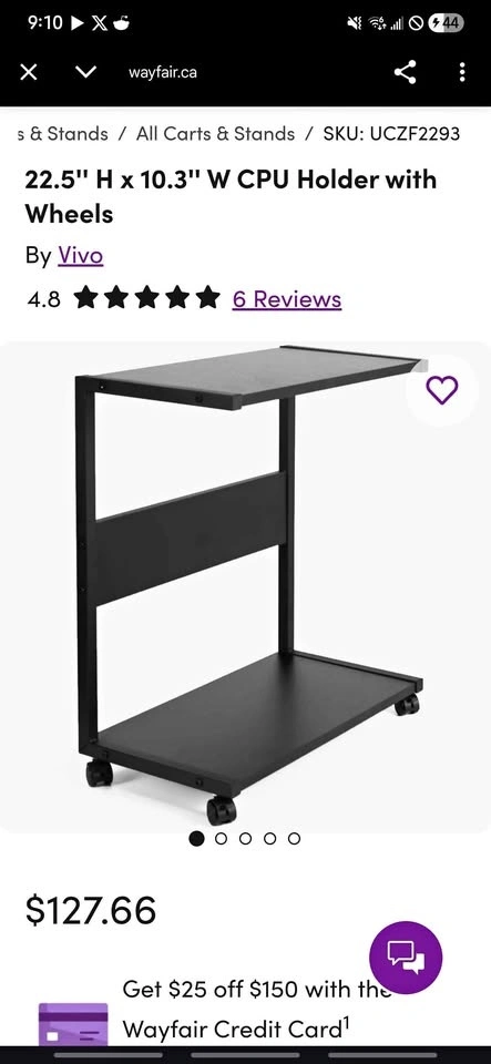 Hi there! I'm selling a VIVO CPU holder with wheels. It was a gift, but unfortunately, it doesn't quite fit our setup. It's brand new and in perfect condition. This rolling stand with smooth casters helps keep your computer tower off the floor for better airflow and cleanliness. It has a strong metal frame with a black finish and a compact footprint, making it ideal for home office or gaming setups. It's also easy to move for cleaning or cable access. Approximate dimensions are Height: 22.5 in and Width: 10.3 in. Pickup is preferred. Cash or e-transfer accepted.