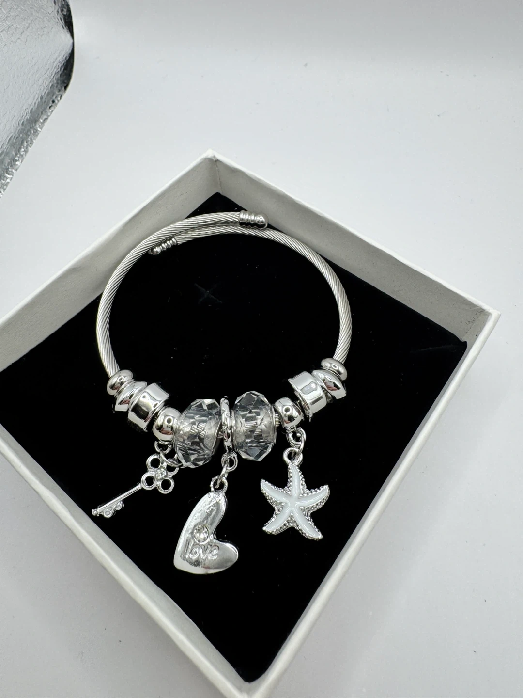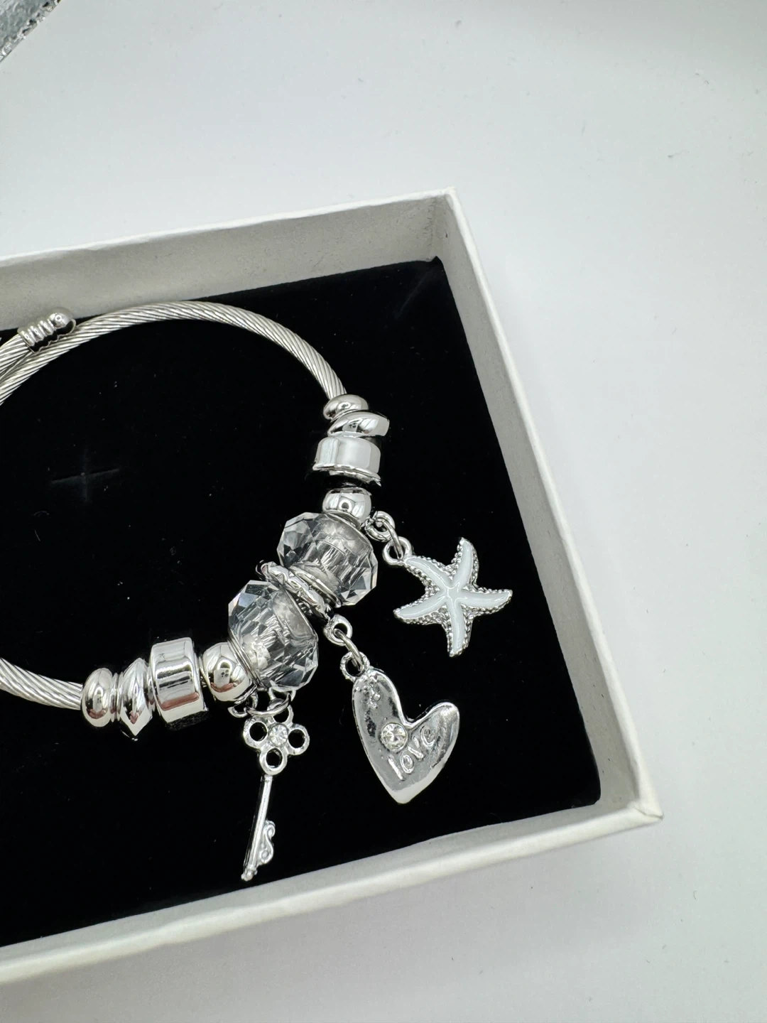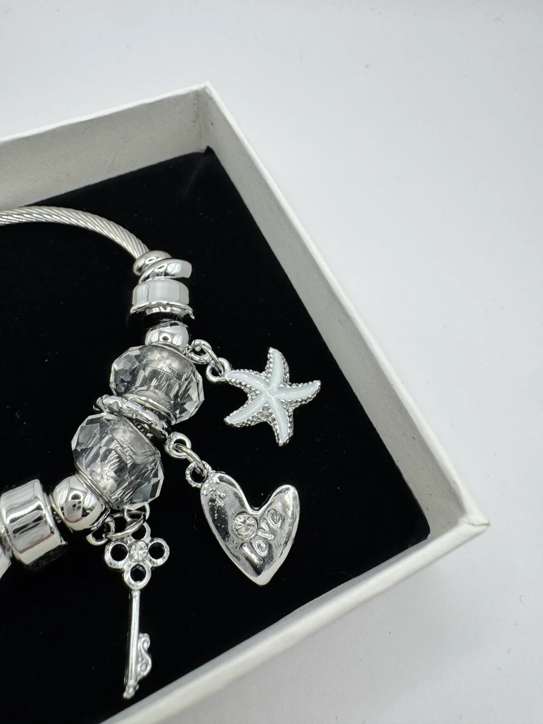 This silver-toned charm bracelet features a twisted cable band. It comes with several decorative charms, including a heart with 'love' inscribed, a vintage-style key, and a white starfish. The bracelet is presented in a white gift box with a black velvet lining.