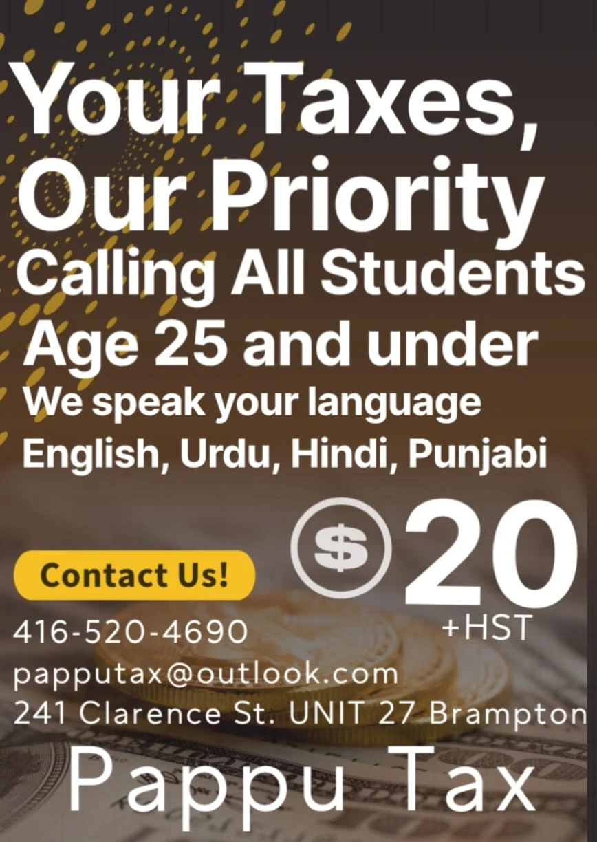 Pappu Tax offers $20 tax for STUDENTS aged 25 and under. We speak English, Urdu, Hindi, and Punjabi.