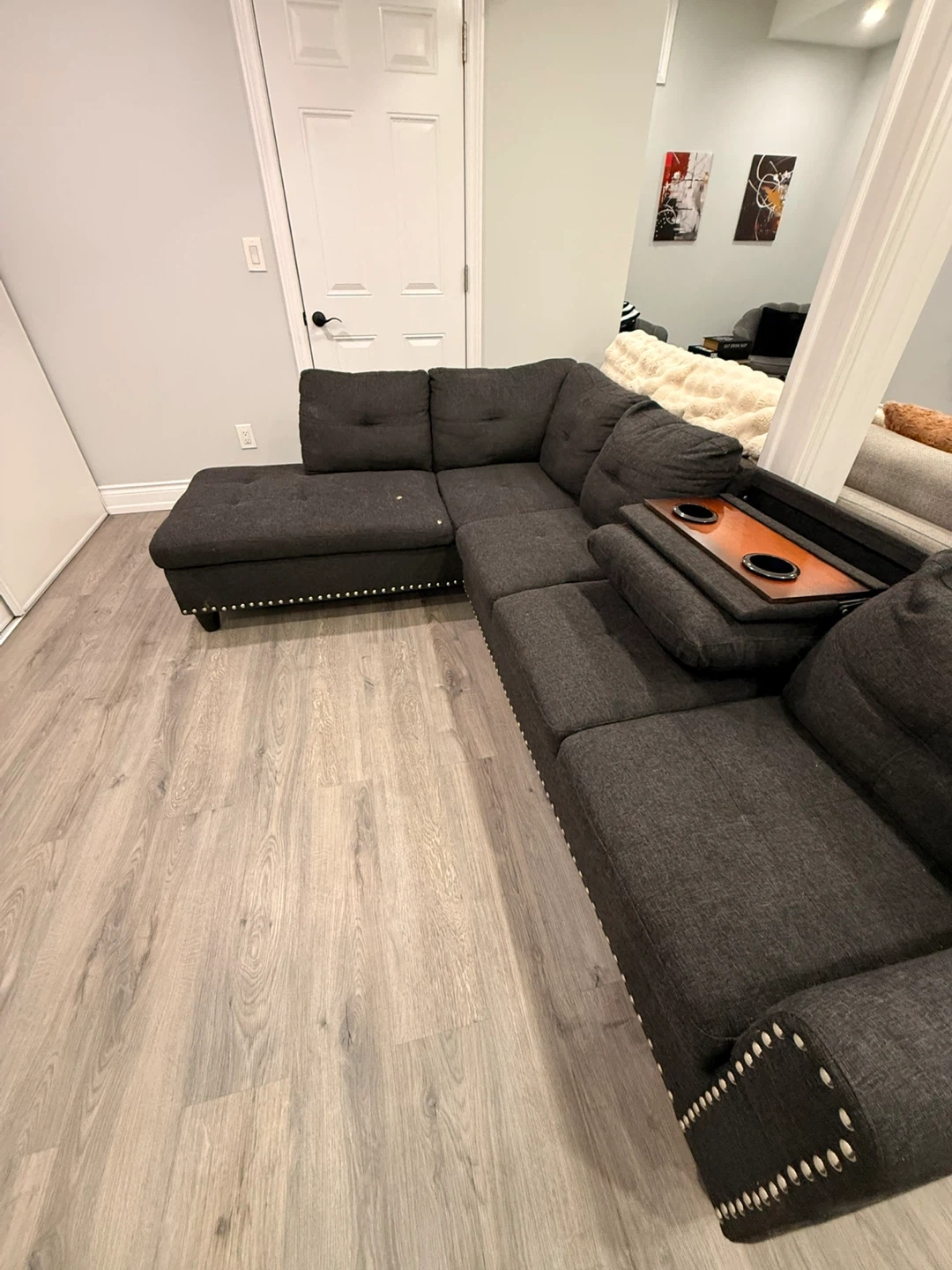 This dark grey sectional sofa features a chaise lounge and a built-in wooden tray with cup holders. It's upholstered in a durable fabric and accented with decorative nailhead trim. This piece is great for relaxing and entertaining!