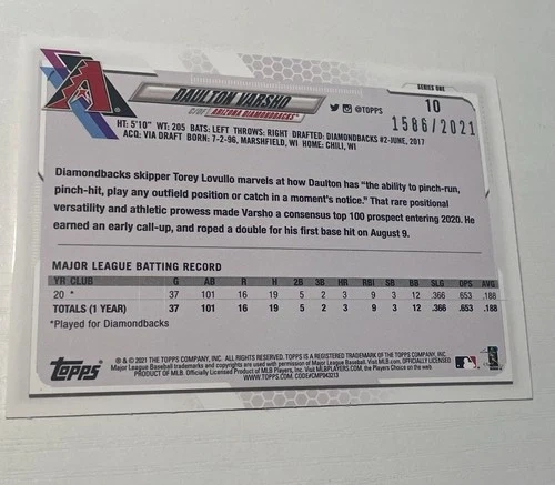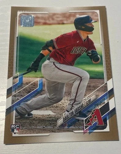 Selling a 2021 Topps Daulton Varsho #10 Gold parallel rookie card. It's a limited edition card from the Arizona Diamondbacks, numbered 1586 out of 2021. The card is in near mint condition and would be a great addition to any baseball card collection.