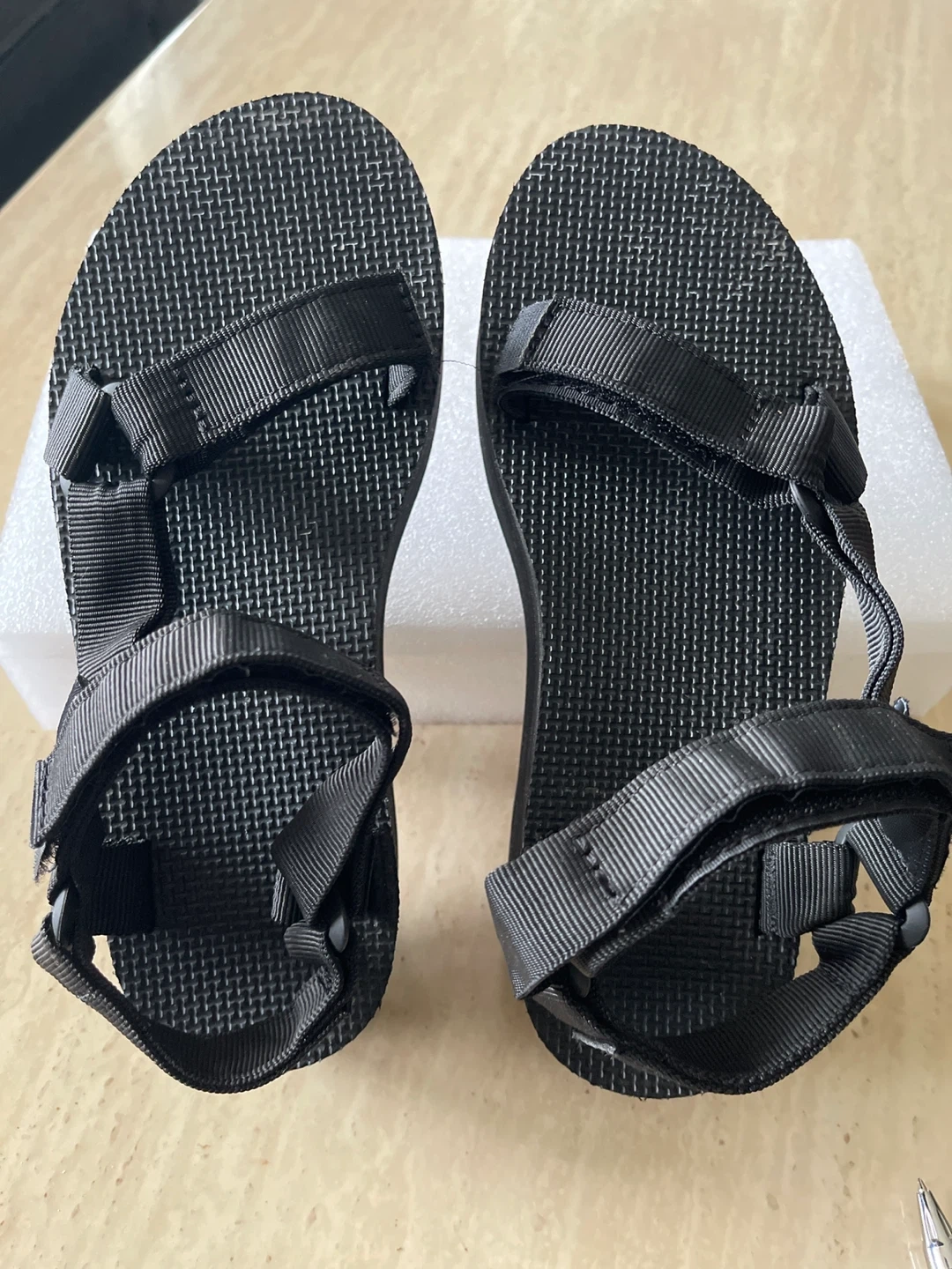 These are used black Teva platform sandals. They feature adjustable straps for a secure fit. Perfect for everyday wear!