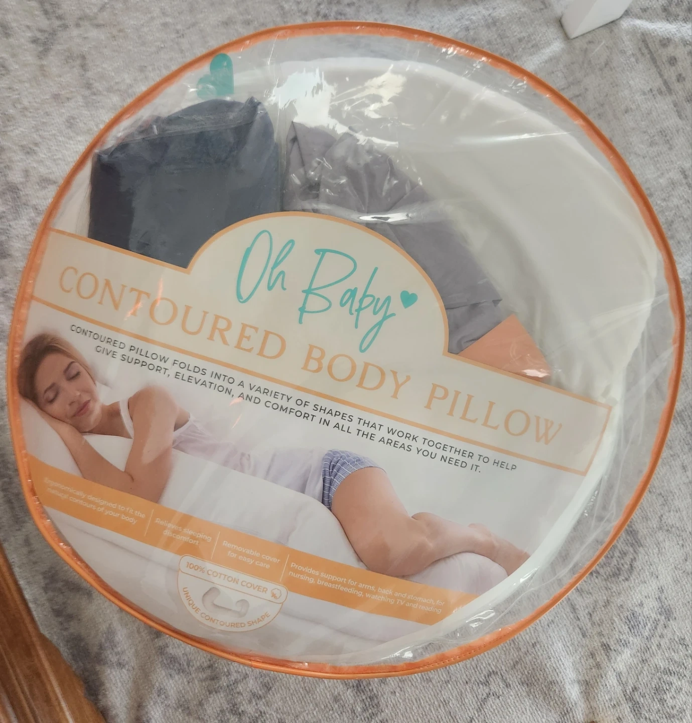This Oh Baby contoured body pillow folds into various shapes for support and comfort. It features a removable 100% cotton cover for easy care. It provides support for nursing, breastfeeding, and reading.