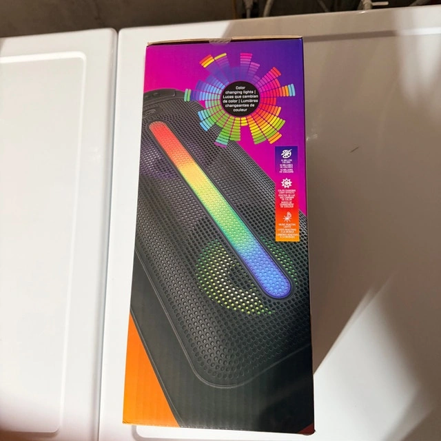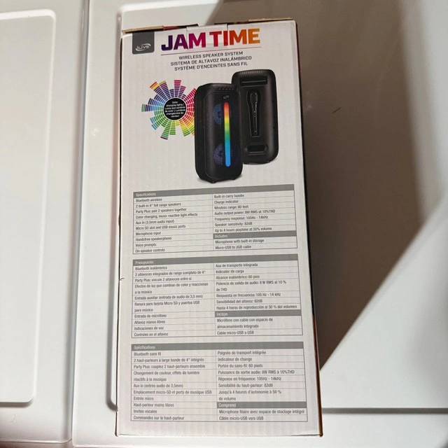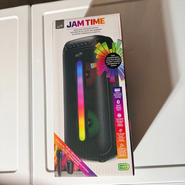 This JAM TIME wireless speaker system is new in the box, never opened, and ready to bring the party to life with its vibrant colour-changing lights! This system includes a microphone with built-in storage and boasts a wireless range of 10 meters. Feel free to message if you have any questions!