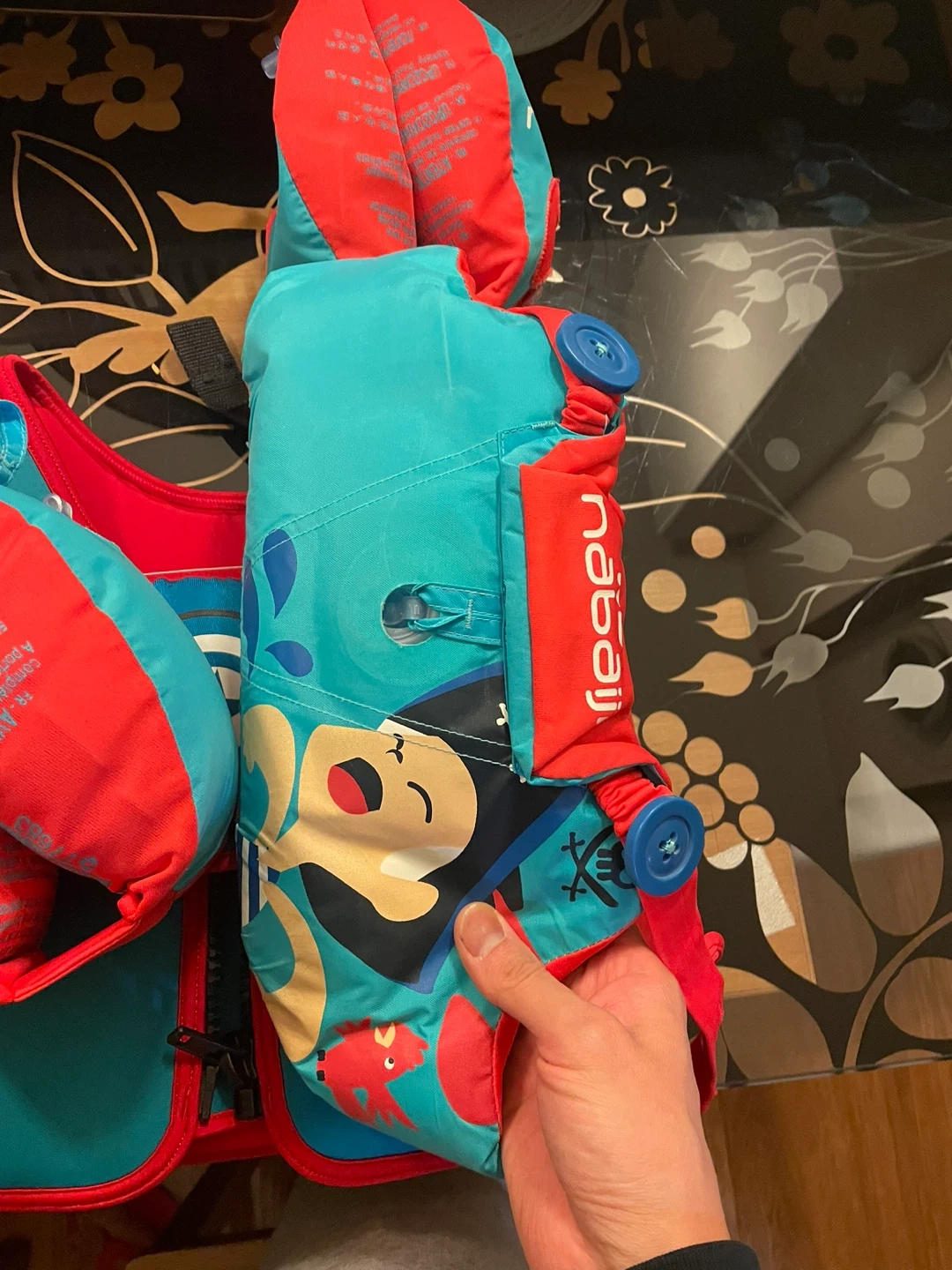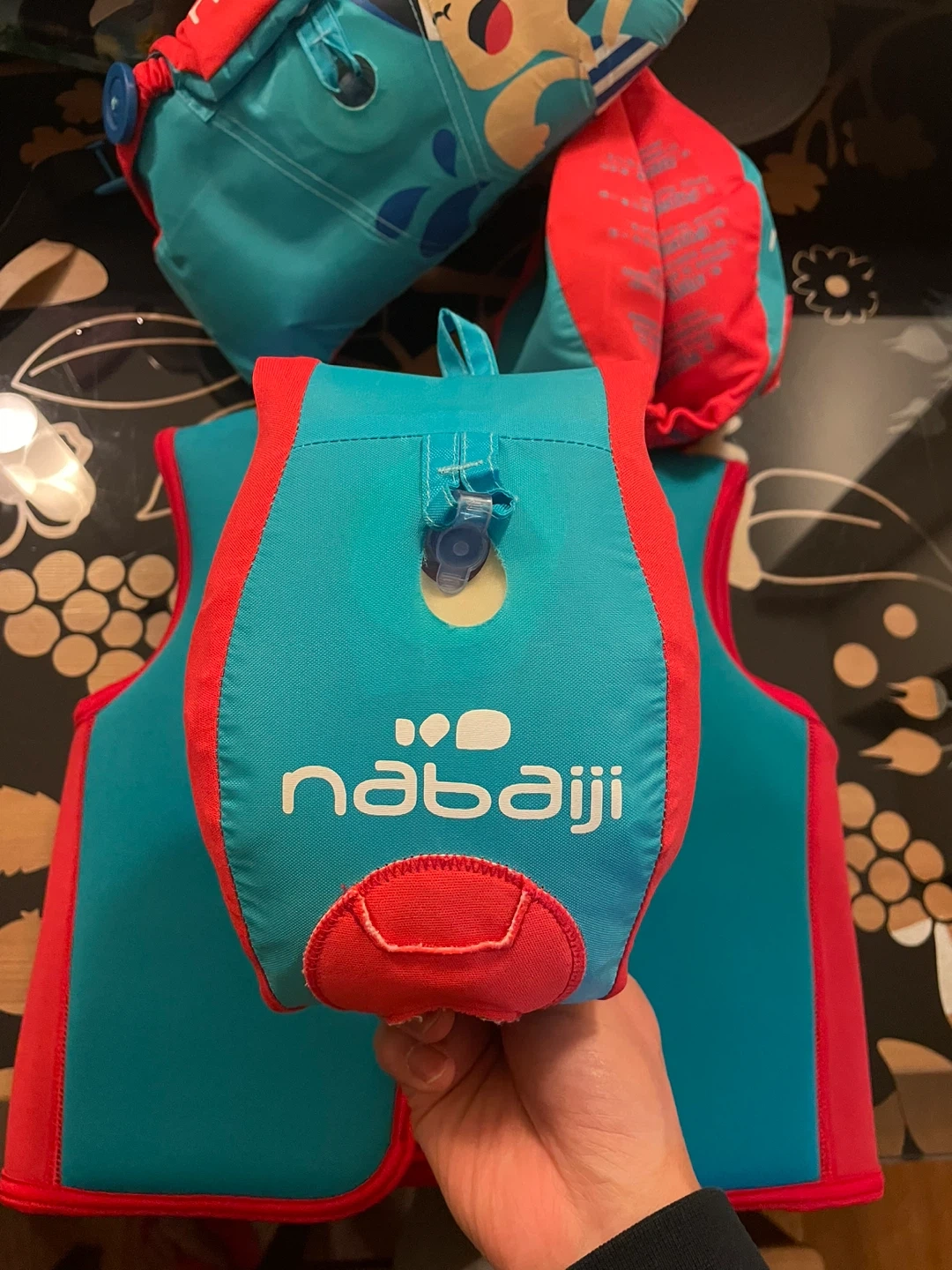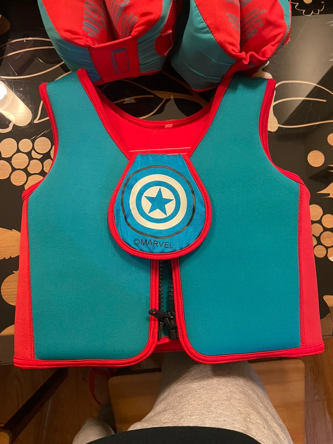 This Nabaiji swim vest comes in a bright teal and red with a cool Marvel Captain America design. It's made for kids and features adjustable straps for a secure fit. The vest is designed for children weighing between 15-30kg. It's perfect for helping young swimmers gain confidence in the water!
