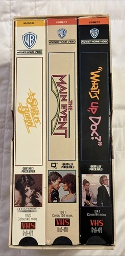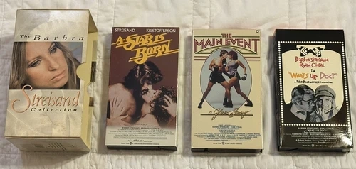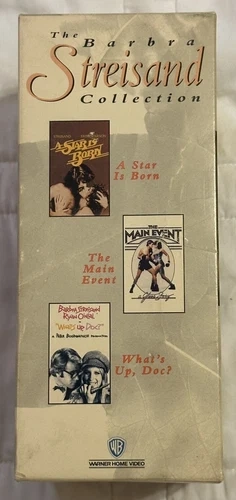 This collection features three classic Barbra Streisand films on VHS: 'A Star Is Born' (1976), 'The Main Event' (1979), and 'What's Up, Doc?' (1972). 'A Star Is Born' is a passionate love story set in the world of rock 'n' roll, co-starring Kris Kristofferson. 'The Main Event' is a screwball comedy where Streisand plays a perfume magnate managing a retired boxer, also starring Ryan O'Neal. 'What's Up, Doc?' is a hilarious screwball comedy with Ryan O'Neal, known for its fast-paced chase scenes through San Francisco.