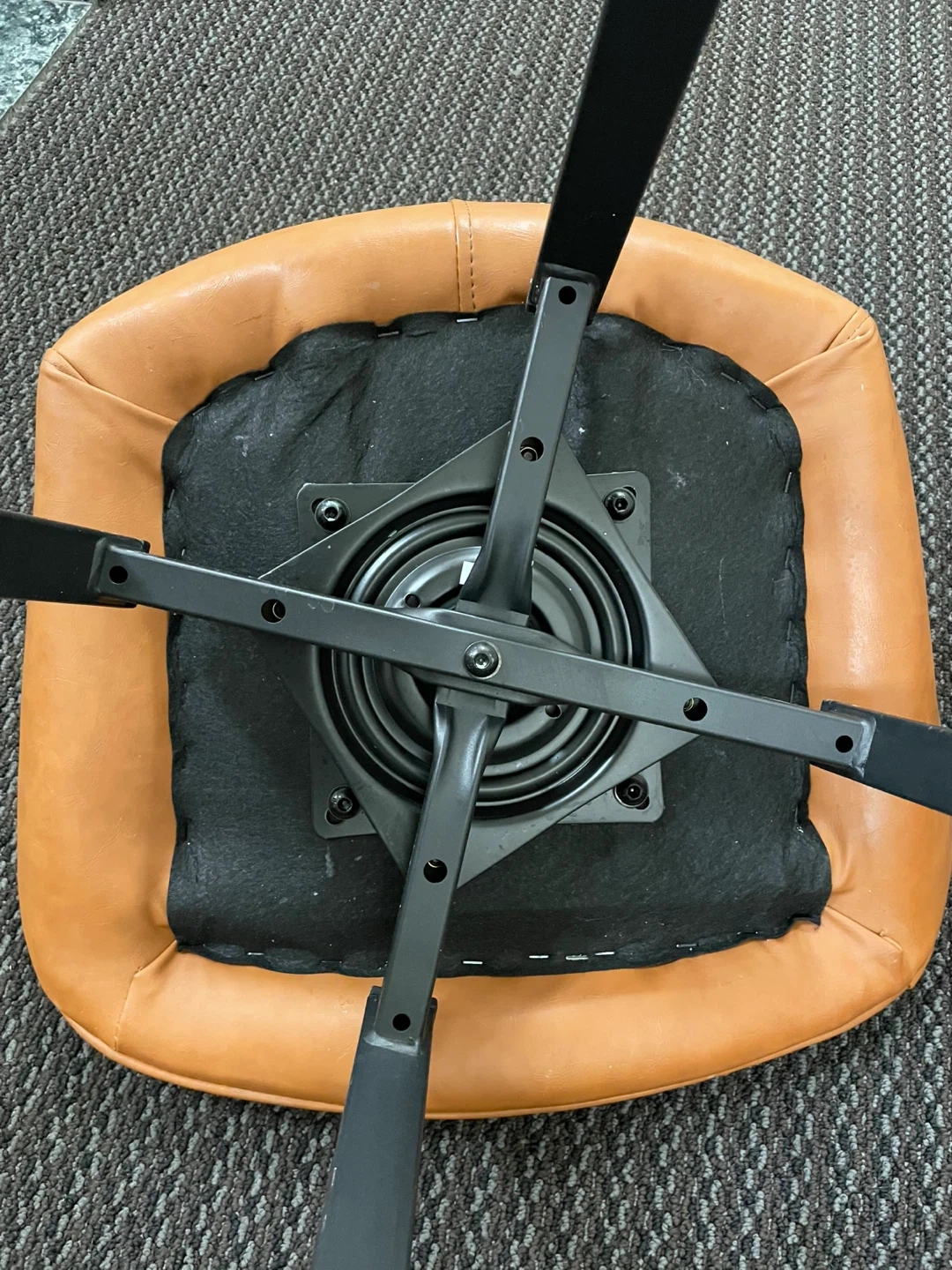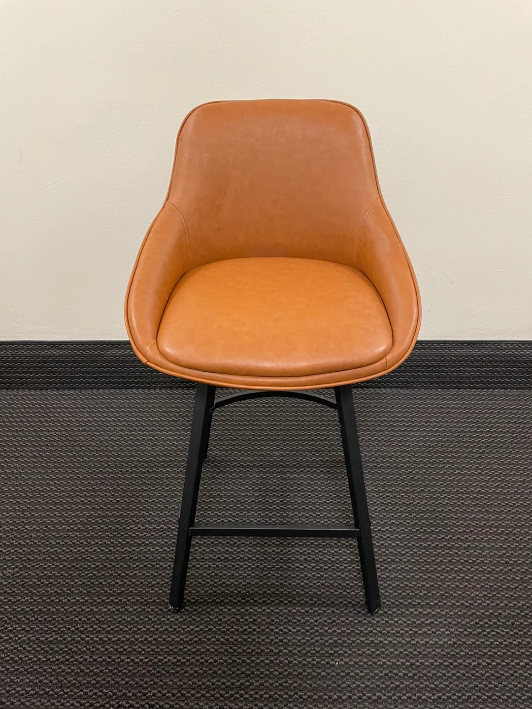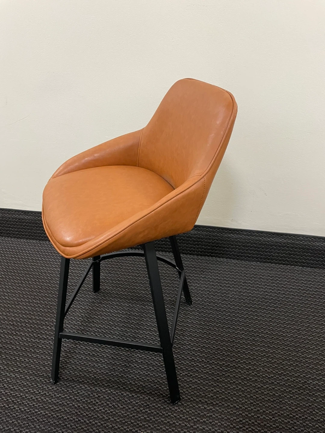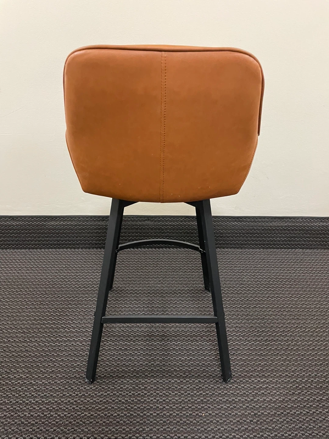 This bar stool features a brown faux leather upholstered seat and backrest. It has a 360-degree swivel function with a sturdy black metal base. A stylish addition to your kitchen or bar area!