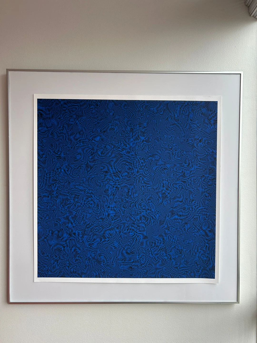 This art print features an abstract wave design in shades of blue, plotted algorithmically. It’s printed on archive quality paper.