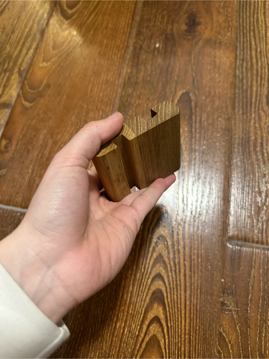 Solid wood phone stand. It has a natural wood finish and a grooved slot to hold your phone securely. This stand is perfect for your desk or nightstand!