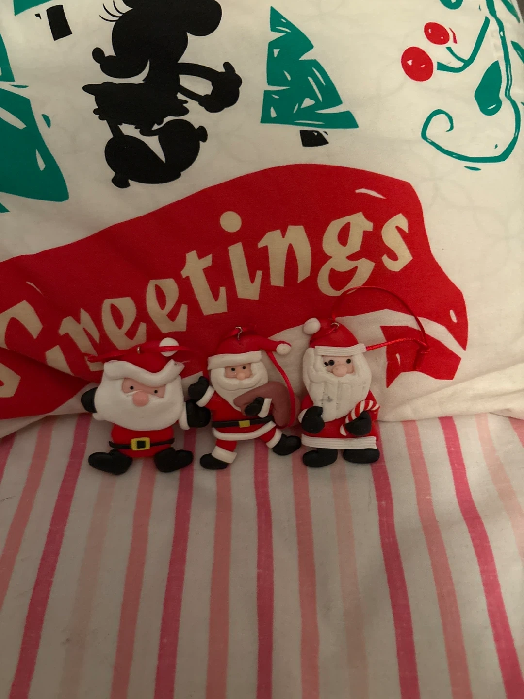 Three cute Santa Claus ornaments for your tree. Each Santa is about 4 inches tall and made of a pliable material. They feature classic Santa designs with red suits and white beards. These ornaments are ready to add some holiday cheer!