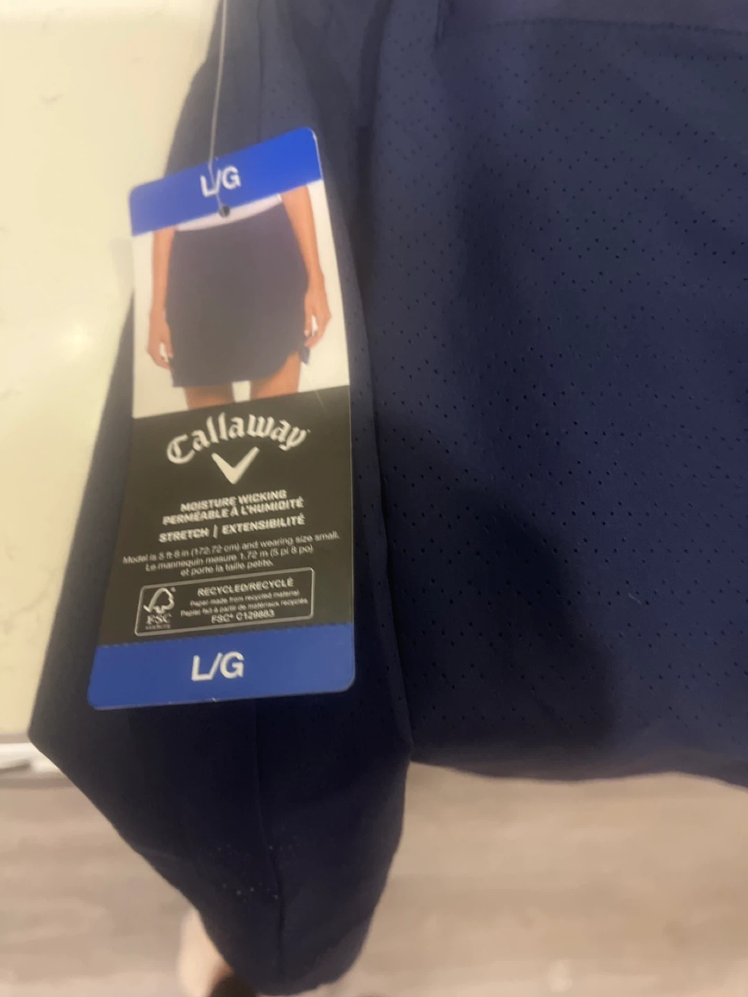 Callaway Truesculpt golf skort in size Large. It's a navy blue colour with a 17-inch inseam. The material is moisture-wicking and has some stretch to it. Perfect for the golf course!