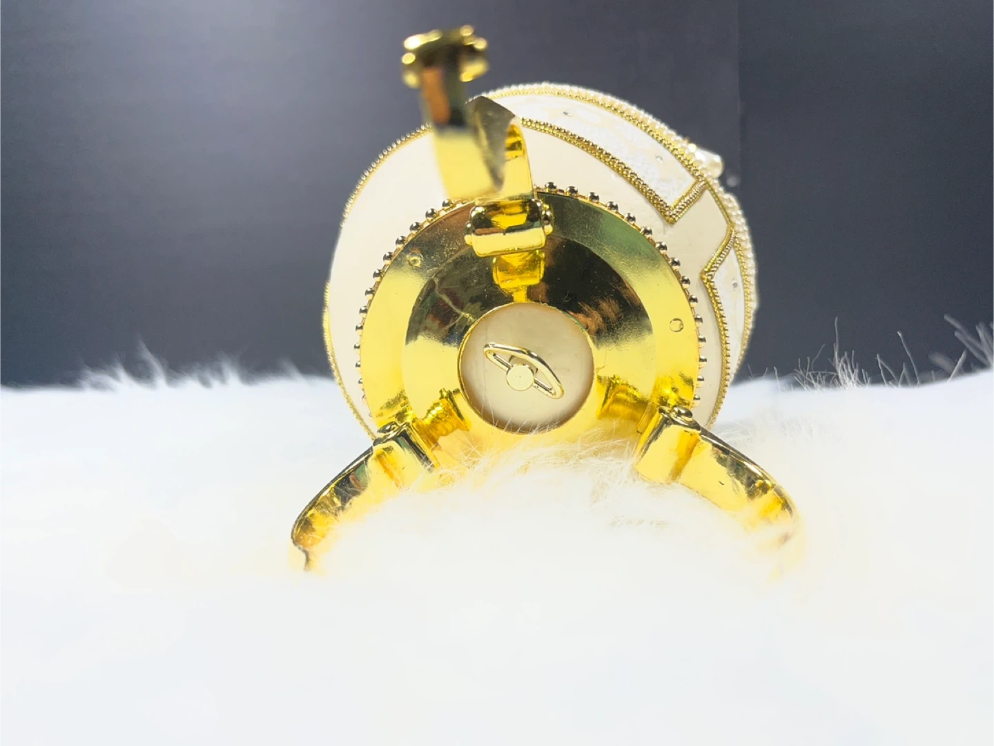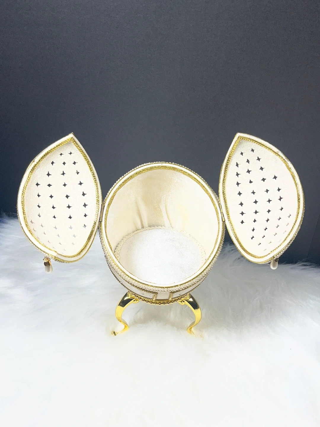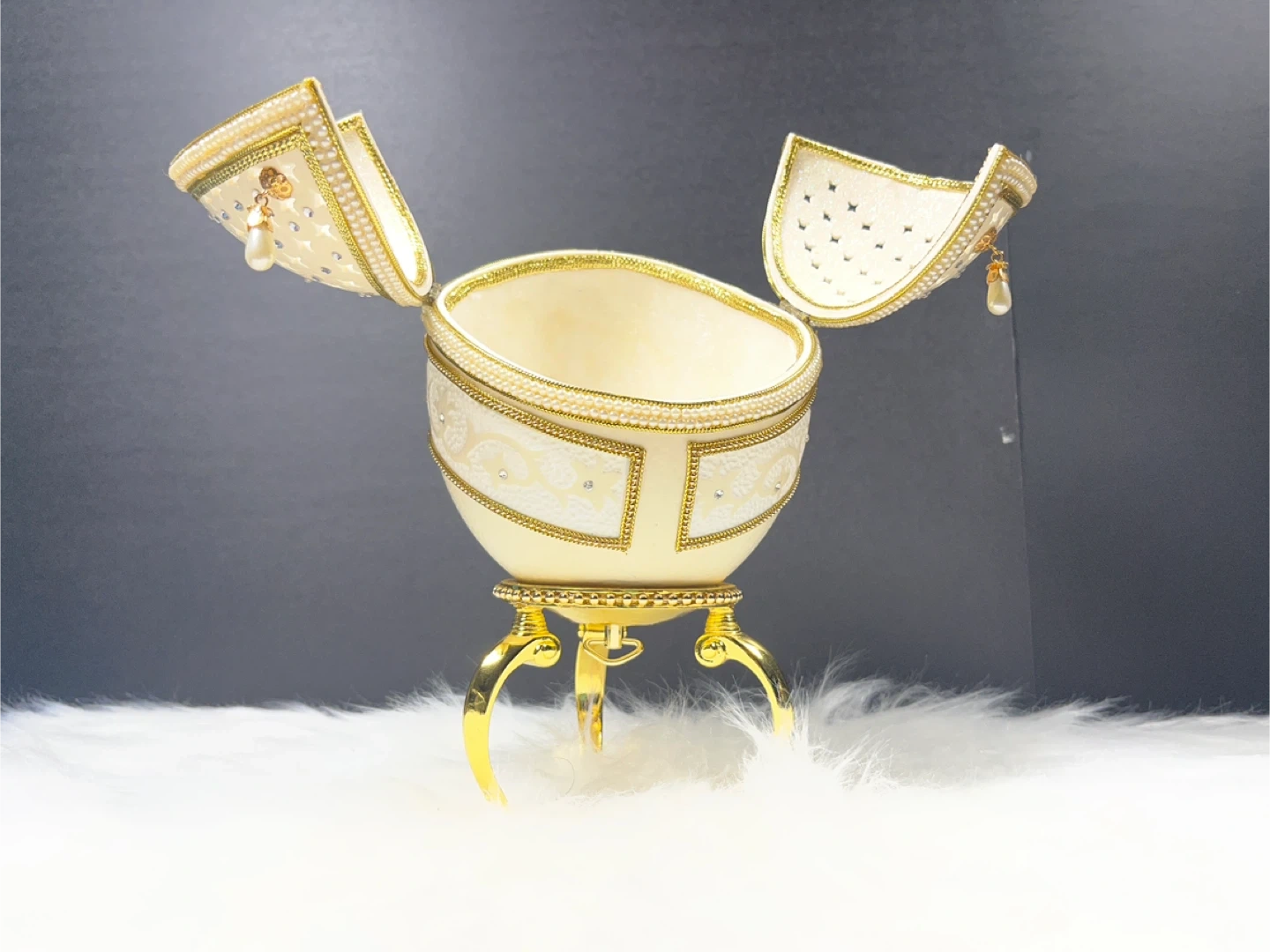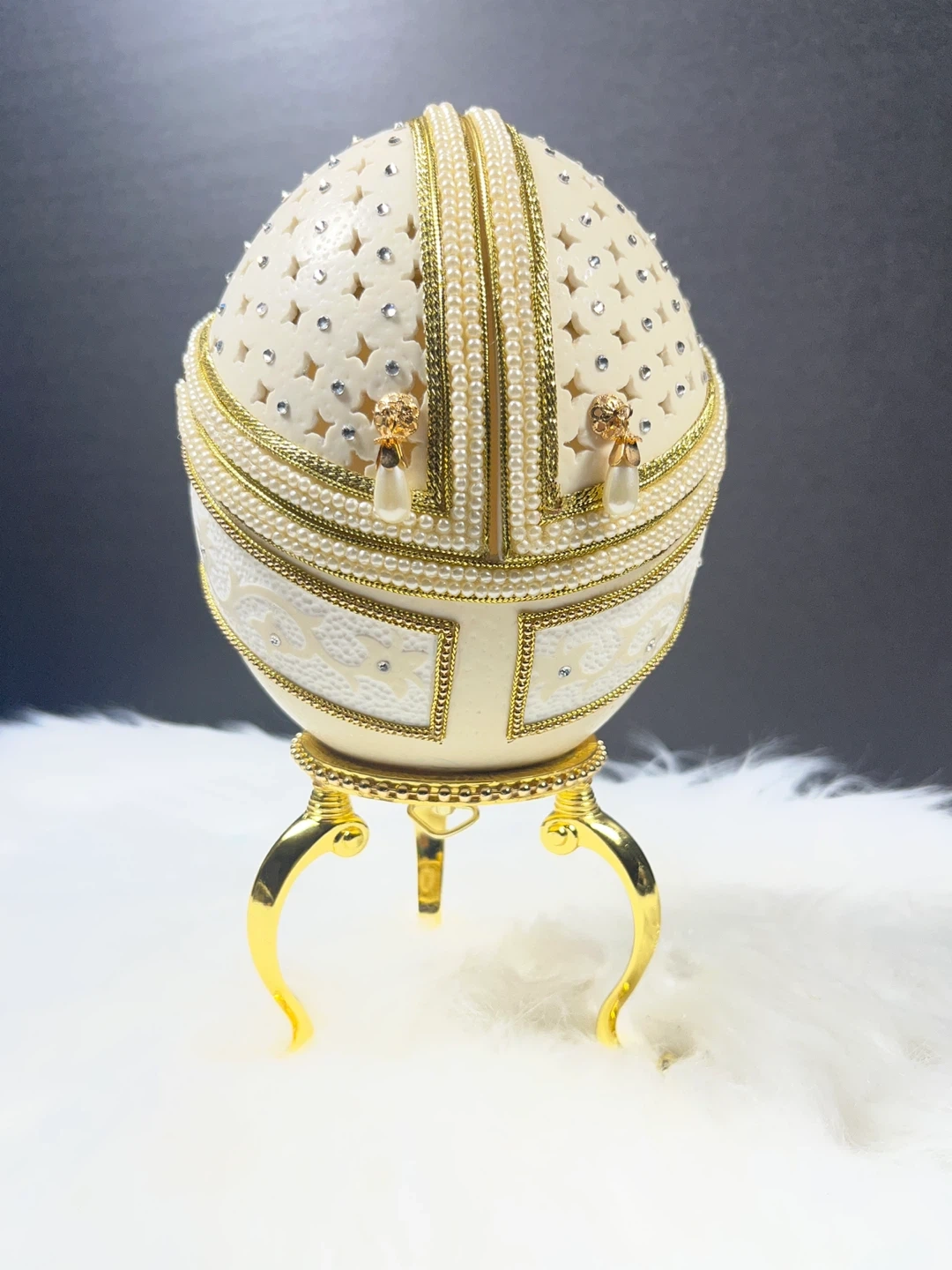 The box is set on a decorative gold-toned stand and often serves a dual purpose as both a jewelry container and a music box; common versions of this model play the tune "I Just Called to Say I Love You". These designs are inspired by the opulent style of Fabergé eggs, which were historically created as extravagant gifts for the Russian royal family.
