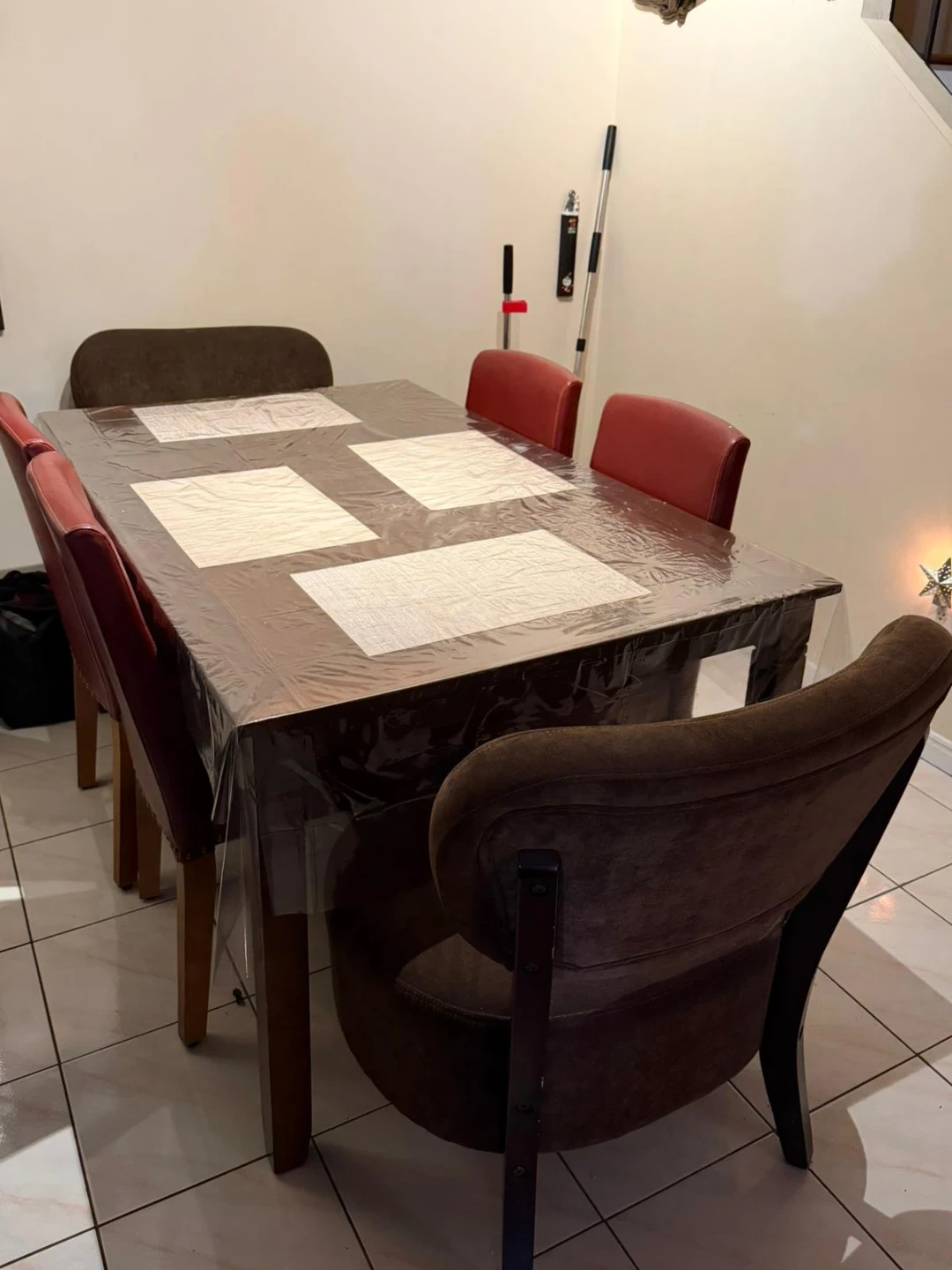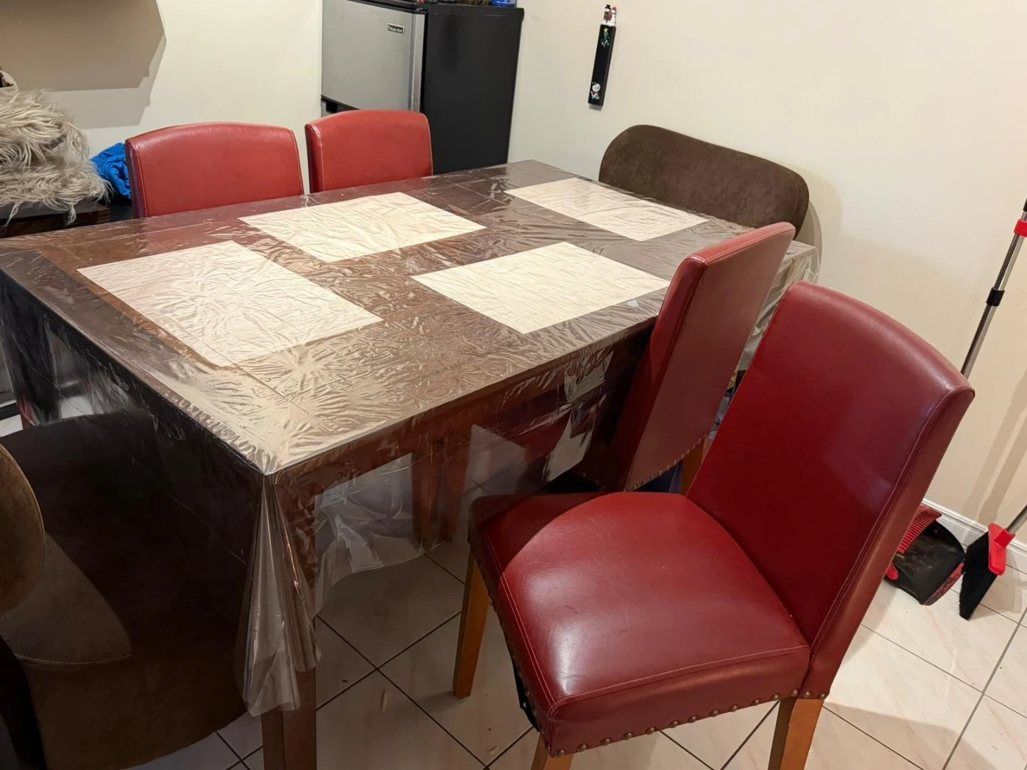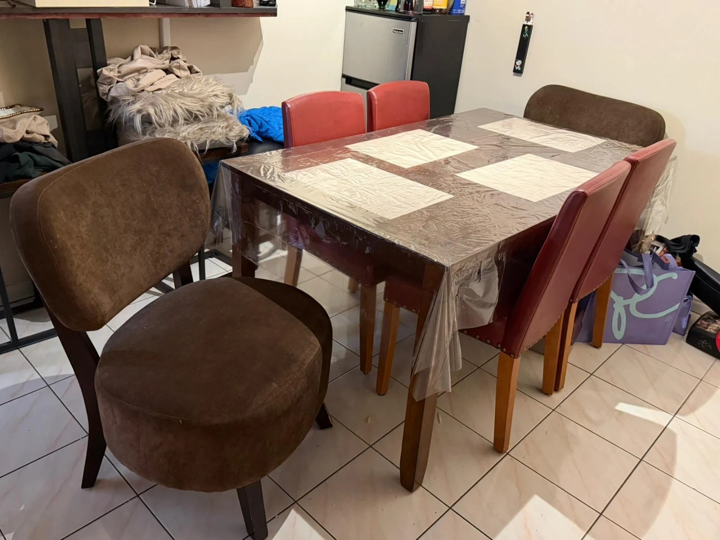 A sturdy dining table with six chairs. The table is dark wood with a clear protective plastic cover. It comes with four red upholstered chairs and two brown upholstered chairs. This set is perfect for family dinners!