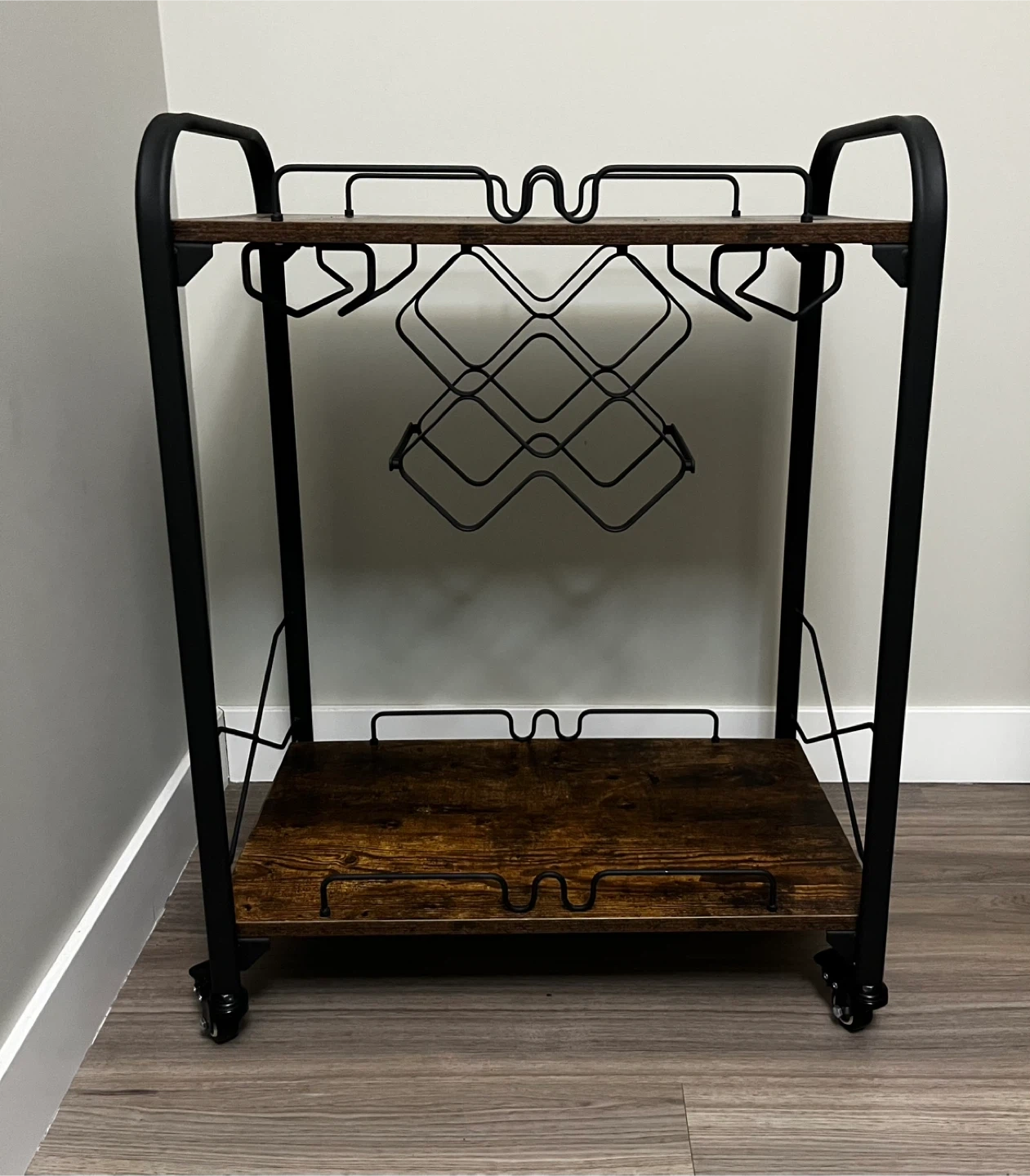 This is a stylish wine cart with a dark wood finish and black metal frame. It features multiple wine glass holders and a rack for wine bottles. The cart is on wheels for easy mobility.