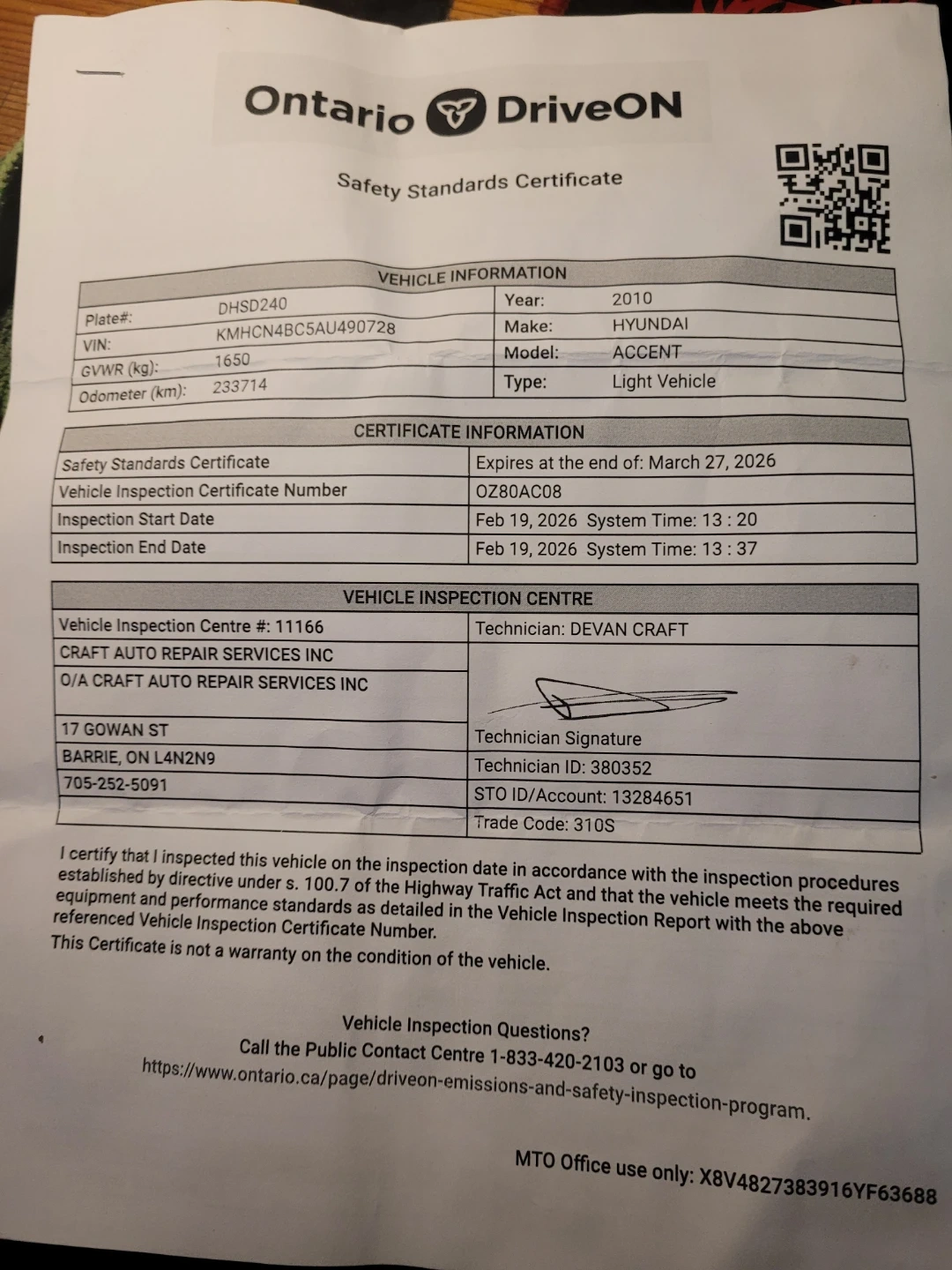 This 2010 Hyundai Accent is a light vehicle. It has a VIN of KMHCN4BC5AU490728 and an odometer reading of 233,714 km. The Safety Standards Certificate expires on March 27, 2026.