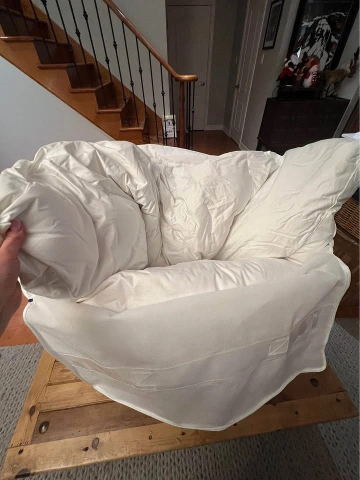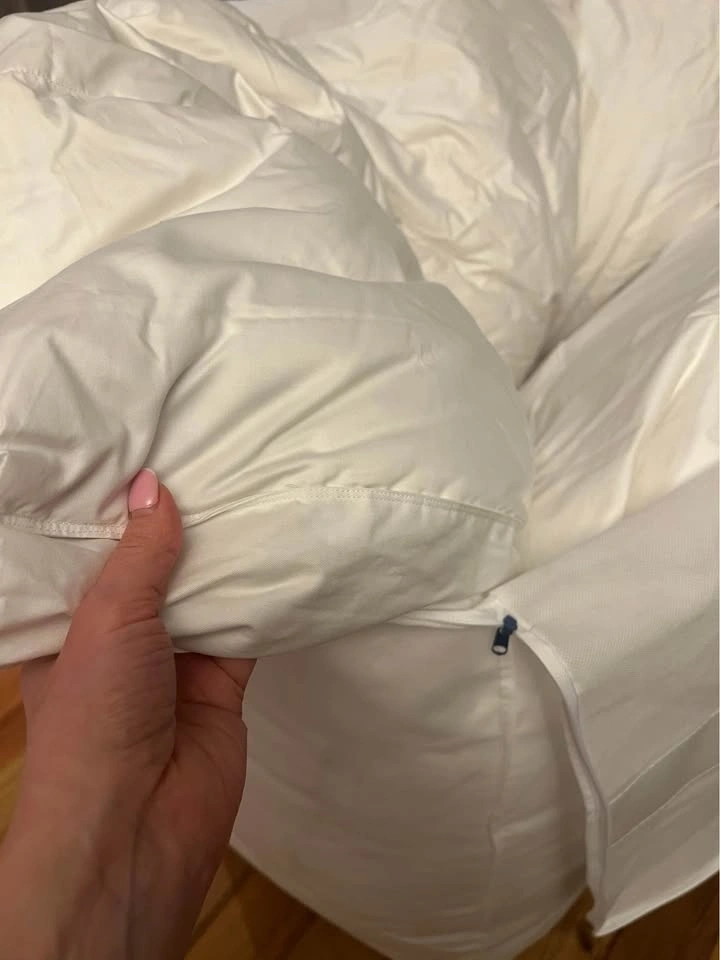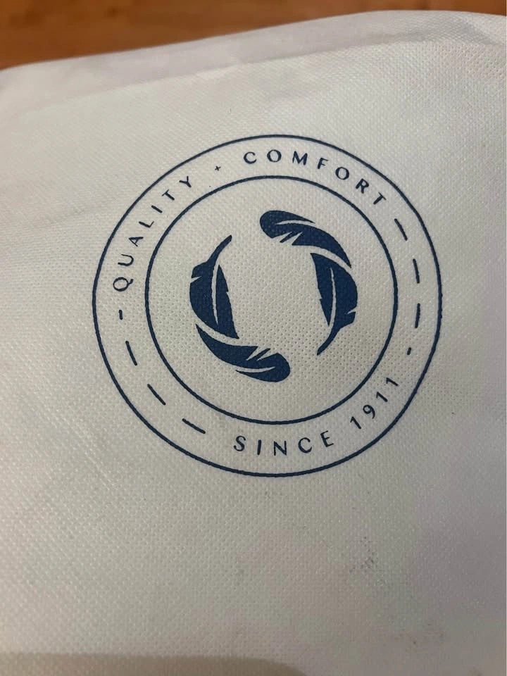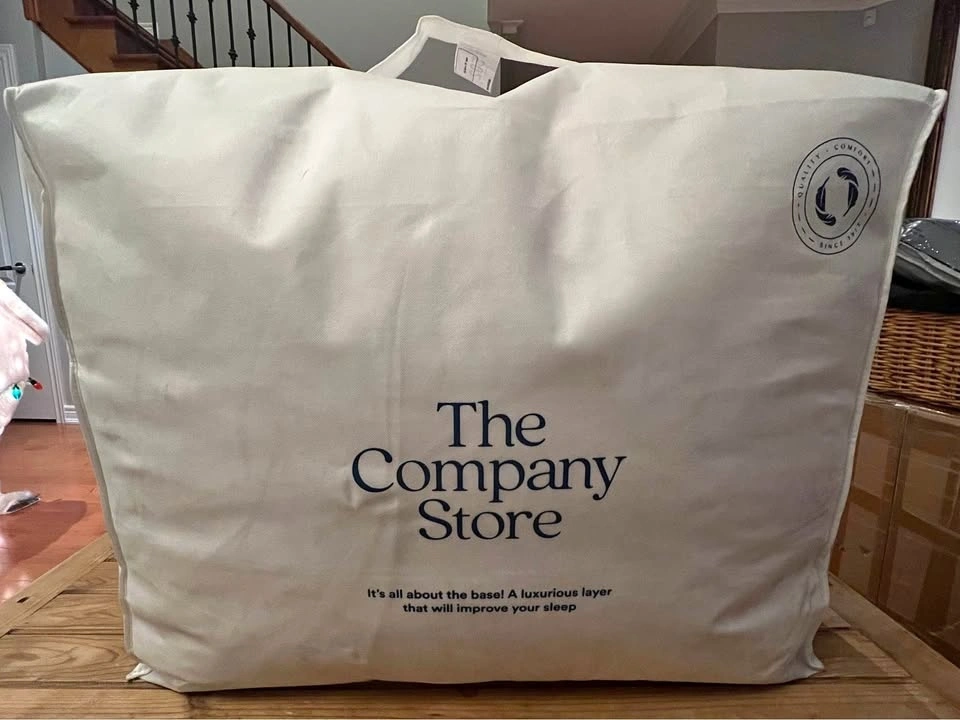 This is a brand new, luxurious two-layer pillowtop featherbed from The Company Store, designed for ultimate softness and comfort. The bottom layer is filled with Hungarian white goose feathers for support, topped with opulent Hungarian white duck down for cushioning. The top layer features a 300-thread count cotton sateen shell with 10” baffle-box stitching to keep the down evenly distributed. It's expertly finished with double-stitched knife edging and a 3” gusset. The down fill is 100% RDS certified, and the materials are OEKO-TEX® STANDARD 100 certified, ensuring safety from harmful substances. Assembled in the USA of fine imported materials. Originally $699 USD (approx. $985 CAD).
