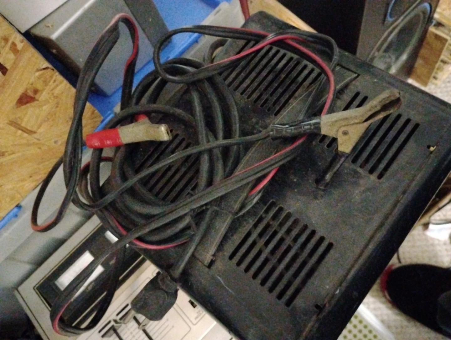 This is a MotoMaster 50/10/2 A, 12 V manual battery charger. It includes an engine start function. The charger has a charge rate selector and a DC amps meter.