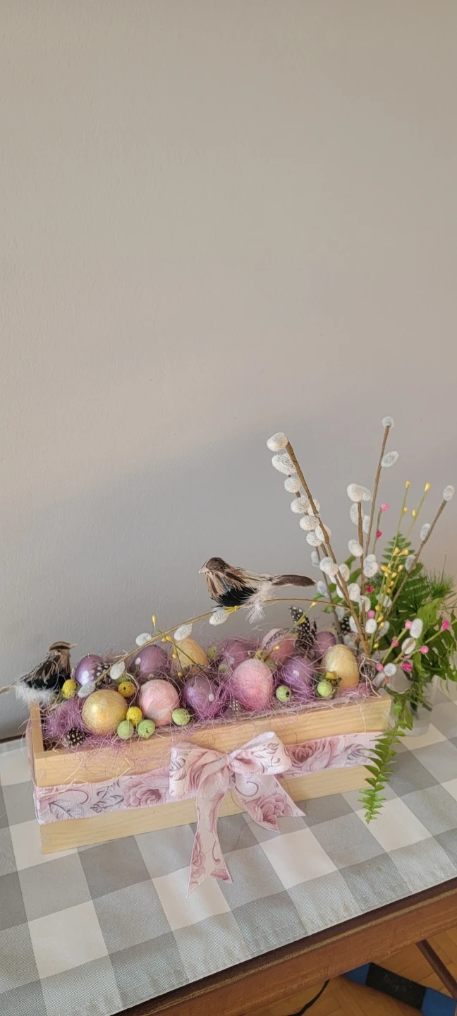 This is a cute Easter decoration, featuring pastel-coloured eggs, a couple of little birds, and some pussy willows in a wooden box with a pretty bow.