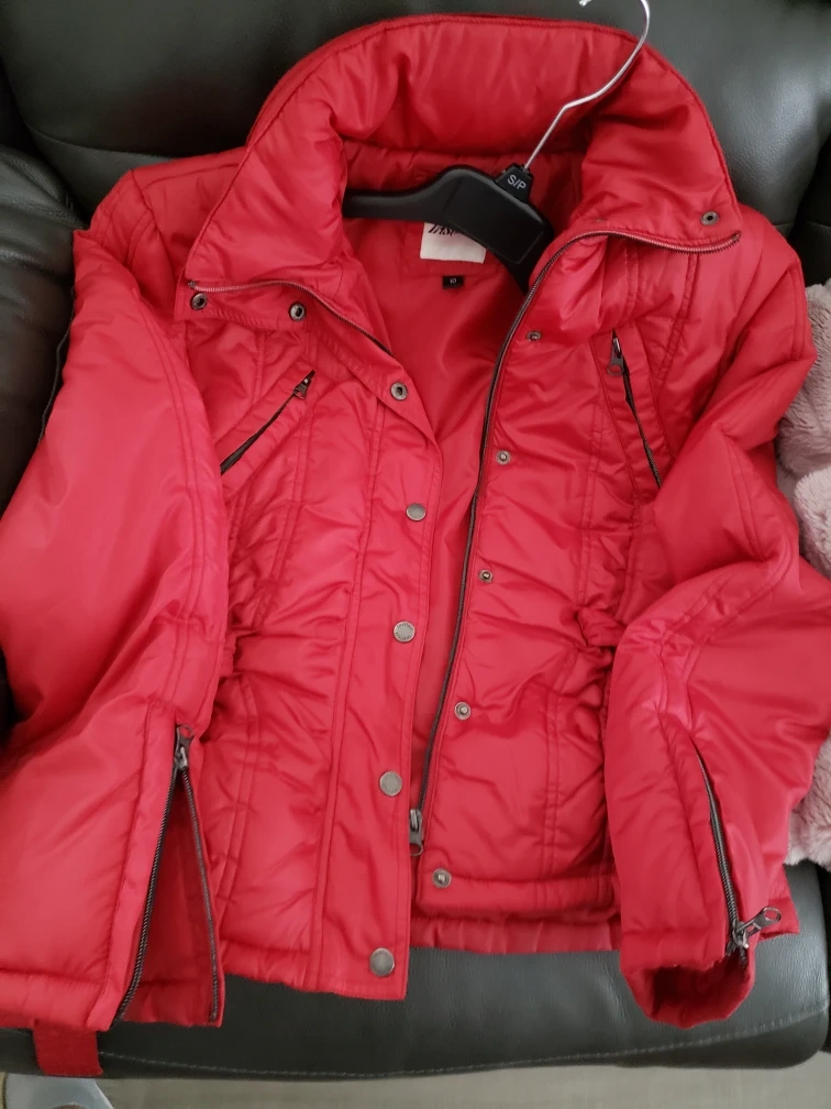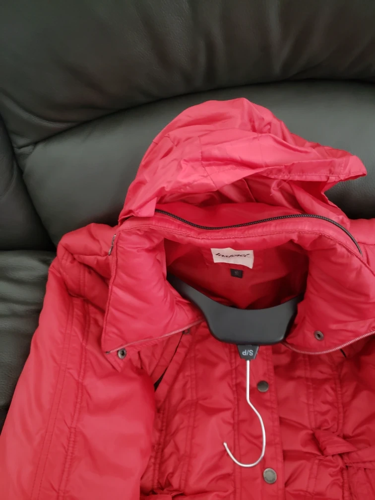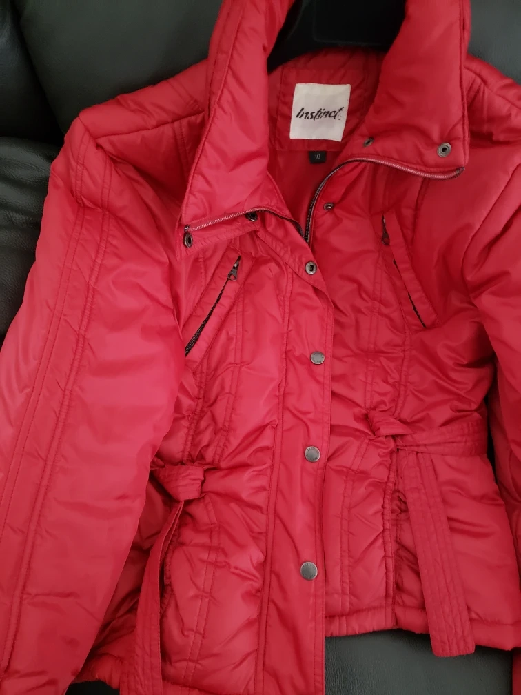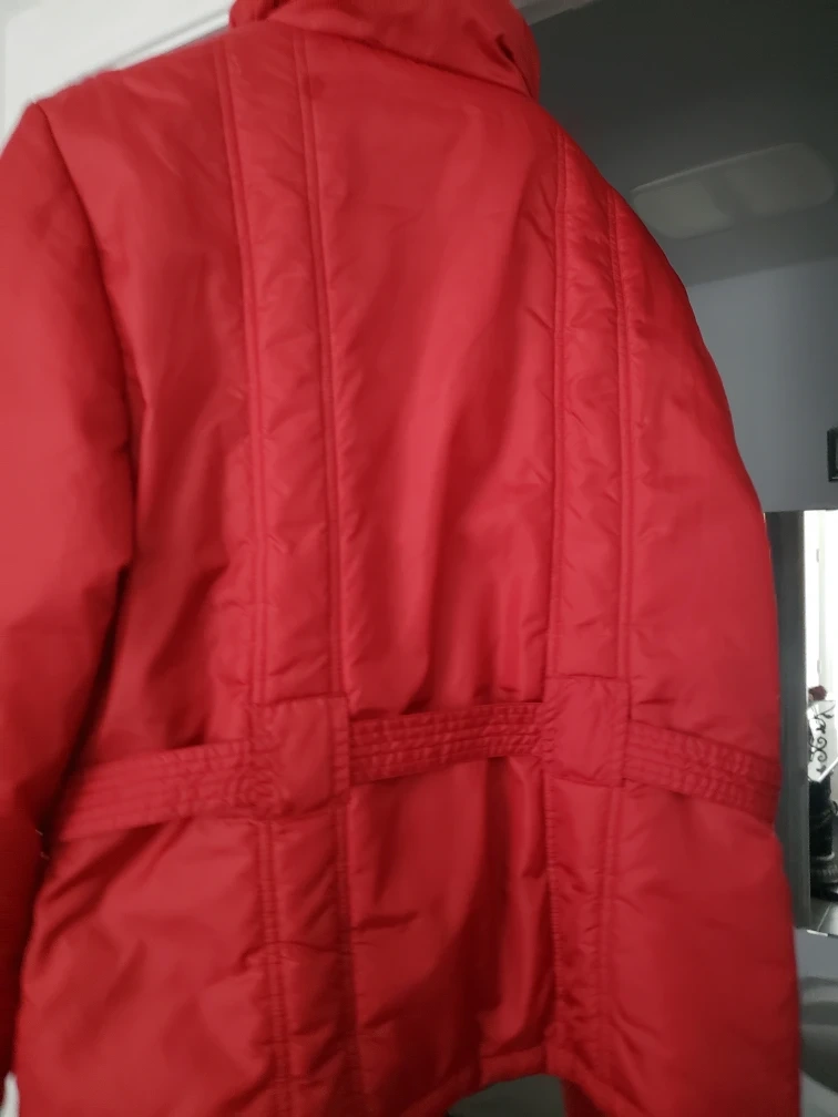 Red puffer jacket with a hood. It has a belt and several pockets with zippers on sleeves and pockets, and zipped hood.