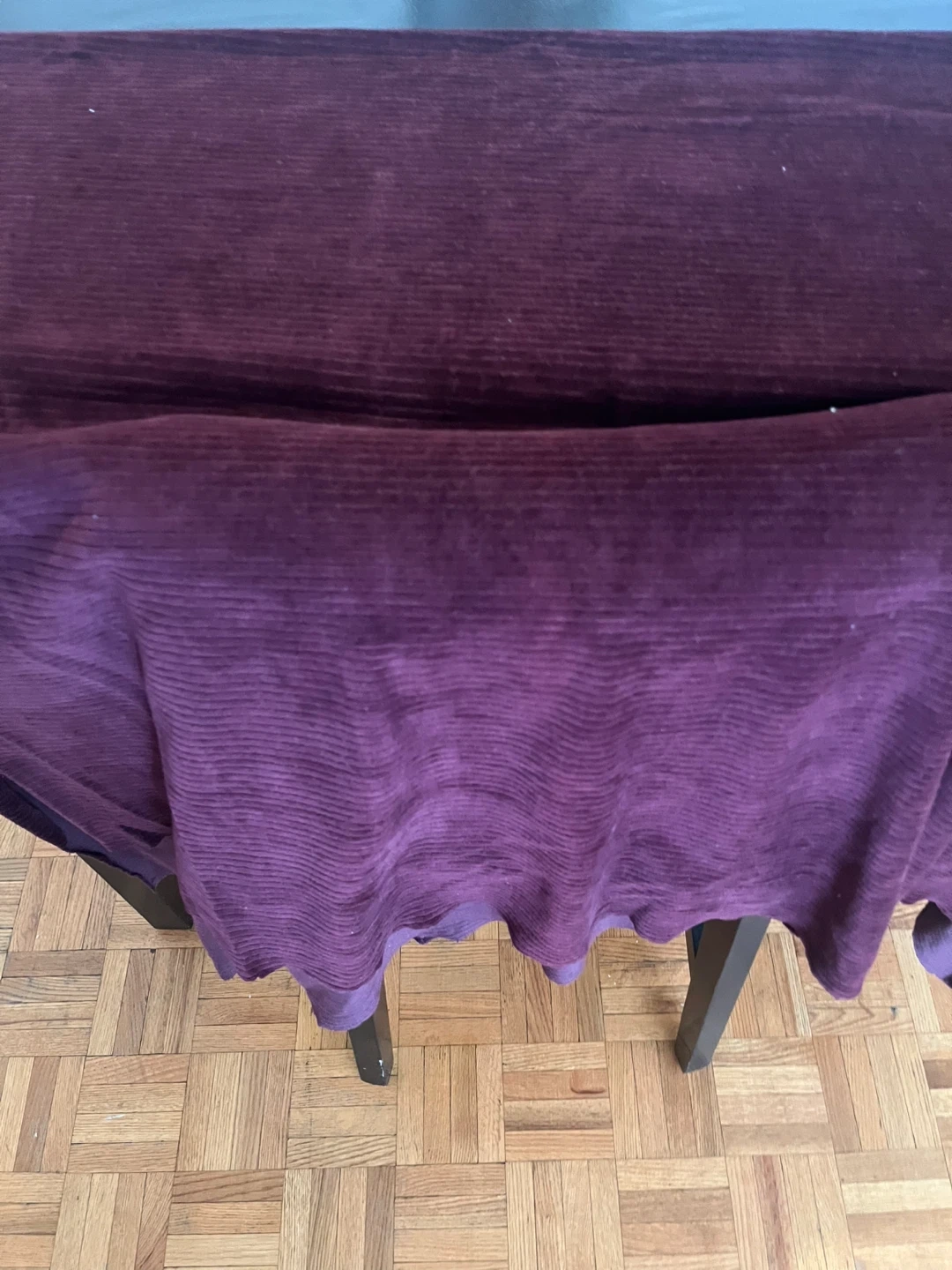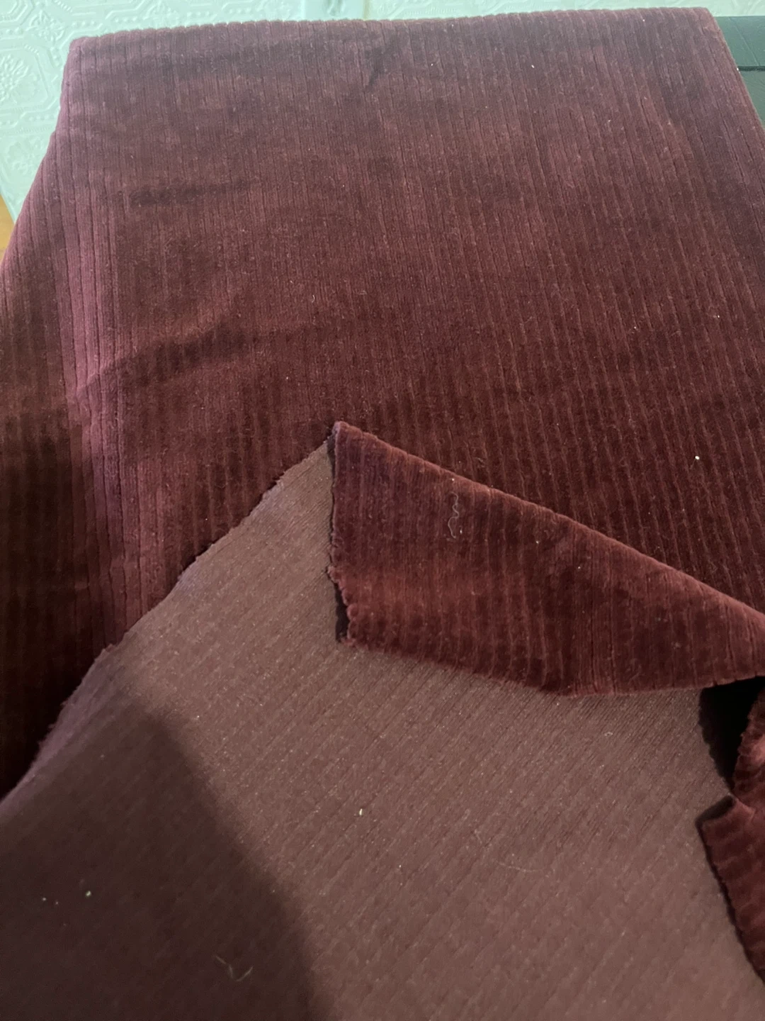 Deep burgundy velour fabric. It's a soft material with distinct wales. Measures approximately 1.5 yards long. Perfect for upholstery or clothing projects!